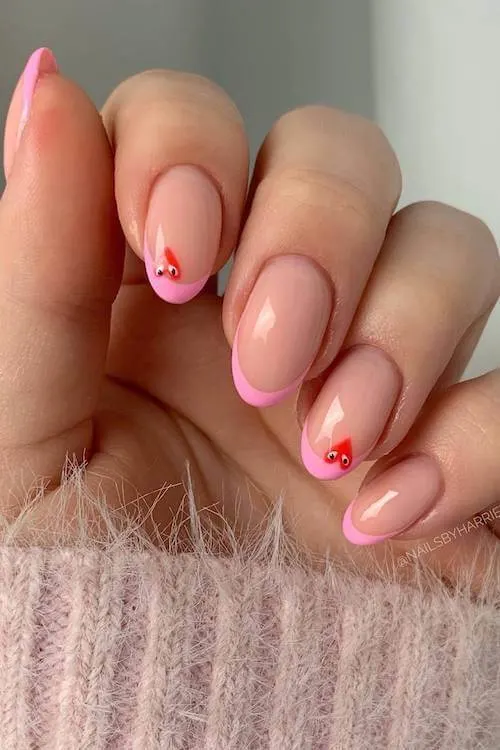 Soft pink French tips meet a minimalist pop of red, thanks to the tiny heart sitting right at the cuticle. That tiny rhinestone detail makes it sparkle just enough to feel special.