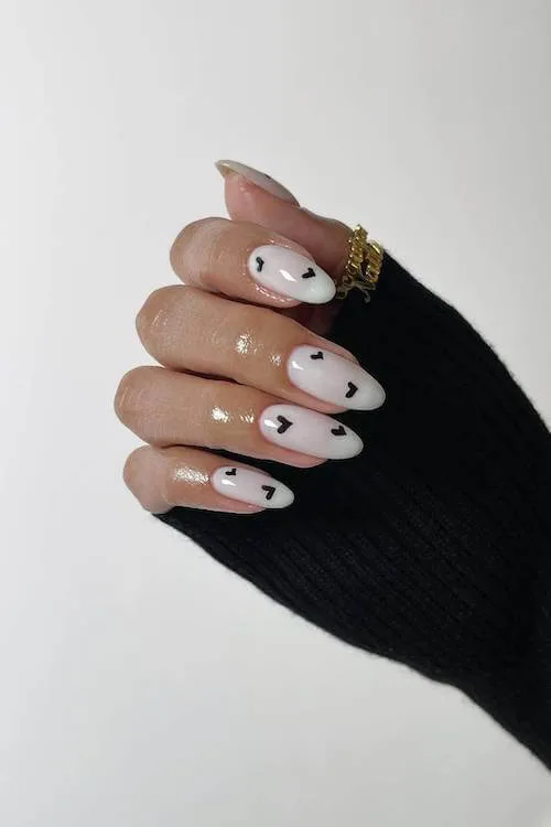 These crisp white nails dotted with tiny black hearts are giving “Valentine’s Day, but make it editorial.” Clean, graphic, and stylish without an ounce of fuss.