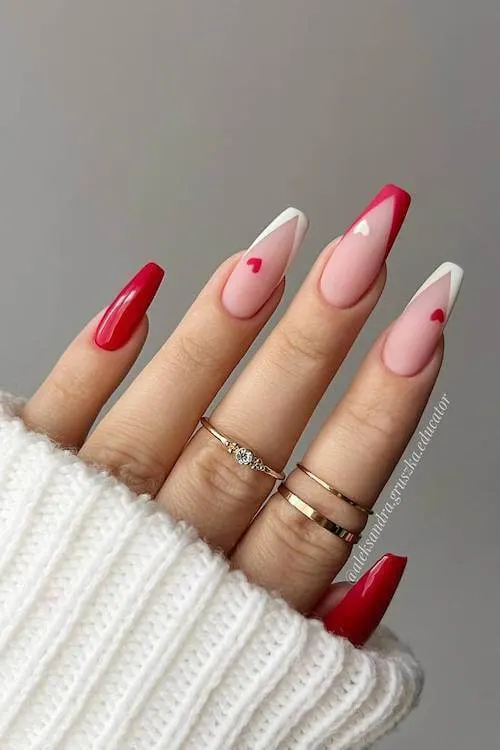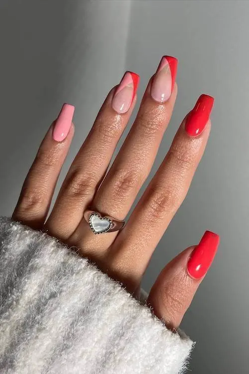 These nails feel like candy—bright, glossy, and full of personality. The pink and red mix brings a fresh, youthful spin to classic Valentine’s colors, especially with that crisp geometric French on the accent nail.