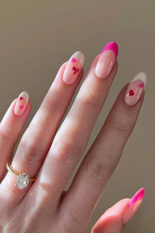 A fresh, bright set full of personality — hot pink, soft pink, and little scattered hearts that feel playful and modern. The mix of French tips and full-color nails makes it feel undone in a chic, editorial way.