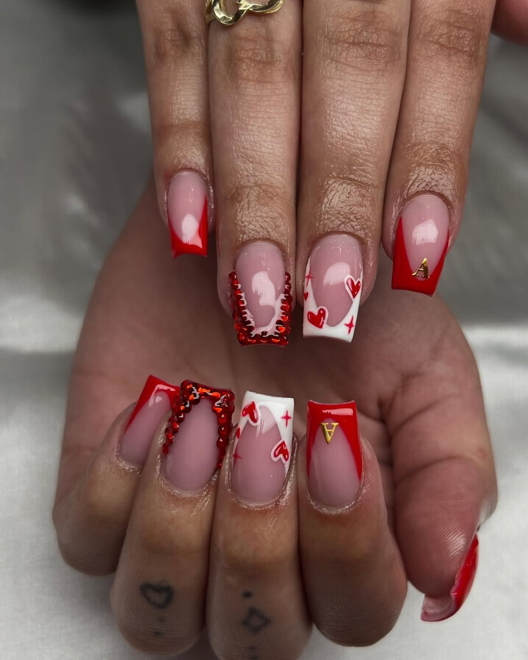 Red French tips, sculpted accents, tiny heart clusters, and even a cheeky little “A” detail — this set channels full playing-card energy in the best, boldest way. It’s dramatic, playful, and totally Valentine-coded.