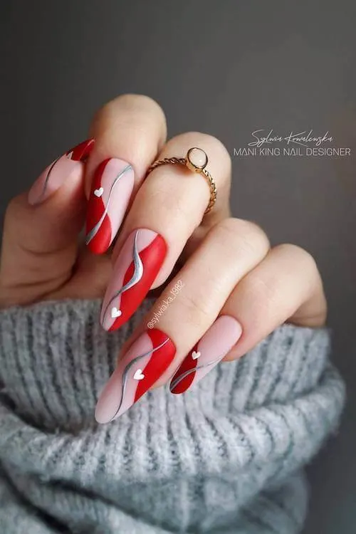 Soft red waves rippling across a nude base—sleek, modern, and just the right amount of Valentine flair. The tiny white hearts nestled into the curves are the sweetest bonus.