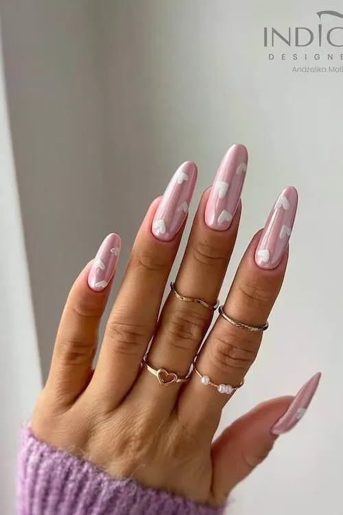 Soft blush pink meets icy white hearts scattered gently across each nail. The elongated almond shape gives everything a graceful silhouette, almost ballerina-like.
