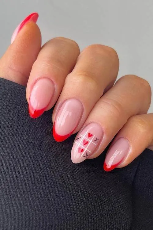 This is Valentine’s nostalgia wrapped in a sleek modern manicure. The soft nude base keeps everything elegant, while the tiny tic-tac-toe hearts add such a charming, playful twist across one nail.