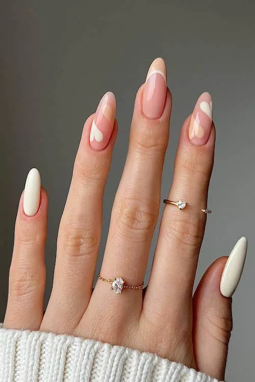 Leave it to The Hot Blend to make Valentine’s nails feel downright bridal. Creamy whites, soft blush hearts, and seamless almond shapes come together like a dream.
