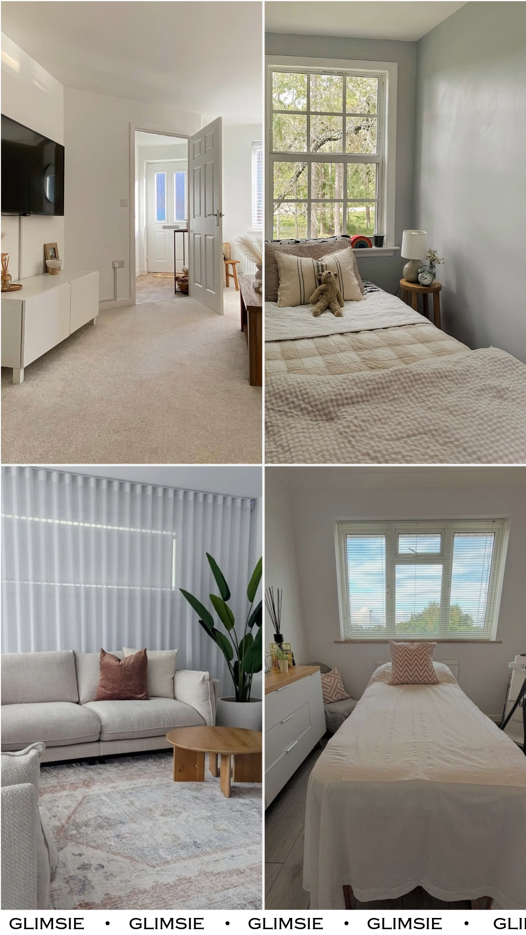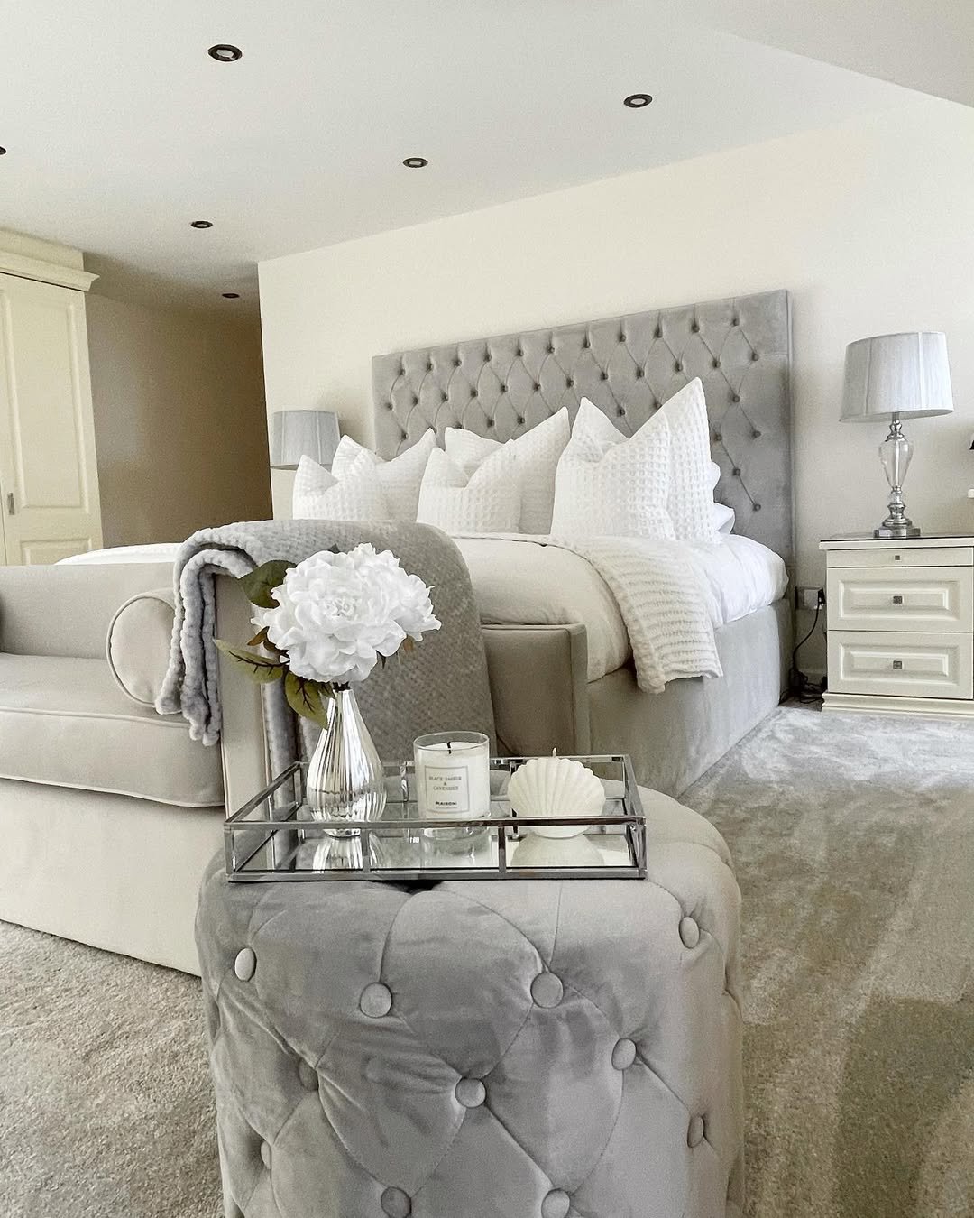 This bedroom feels like stepping into a cloud. Layered bedding, soft greys, and plush textures create a space that feels indulgent but still grounded.