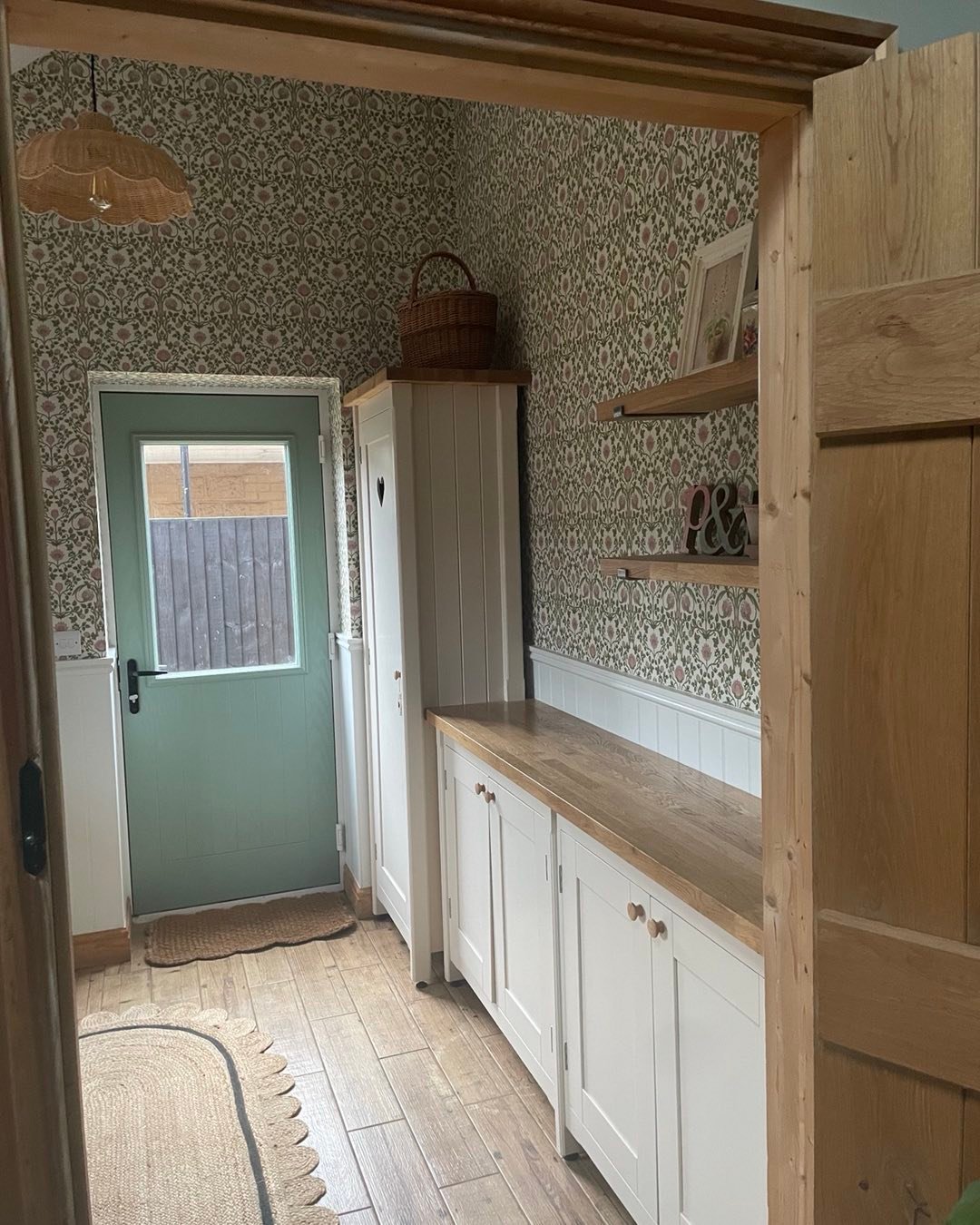 This little entryway has that quiet charm you notice right away. The soft green door, floral wallpaper, and warm wood tones create a space that feels both tidy and welcoming.