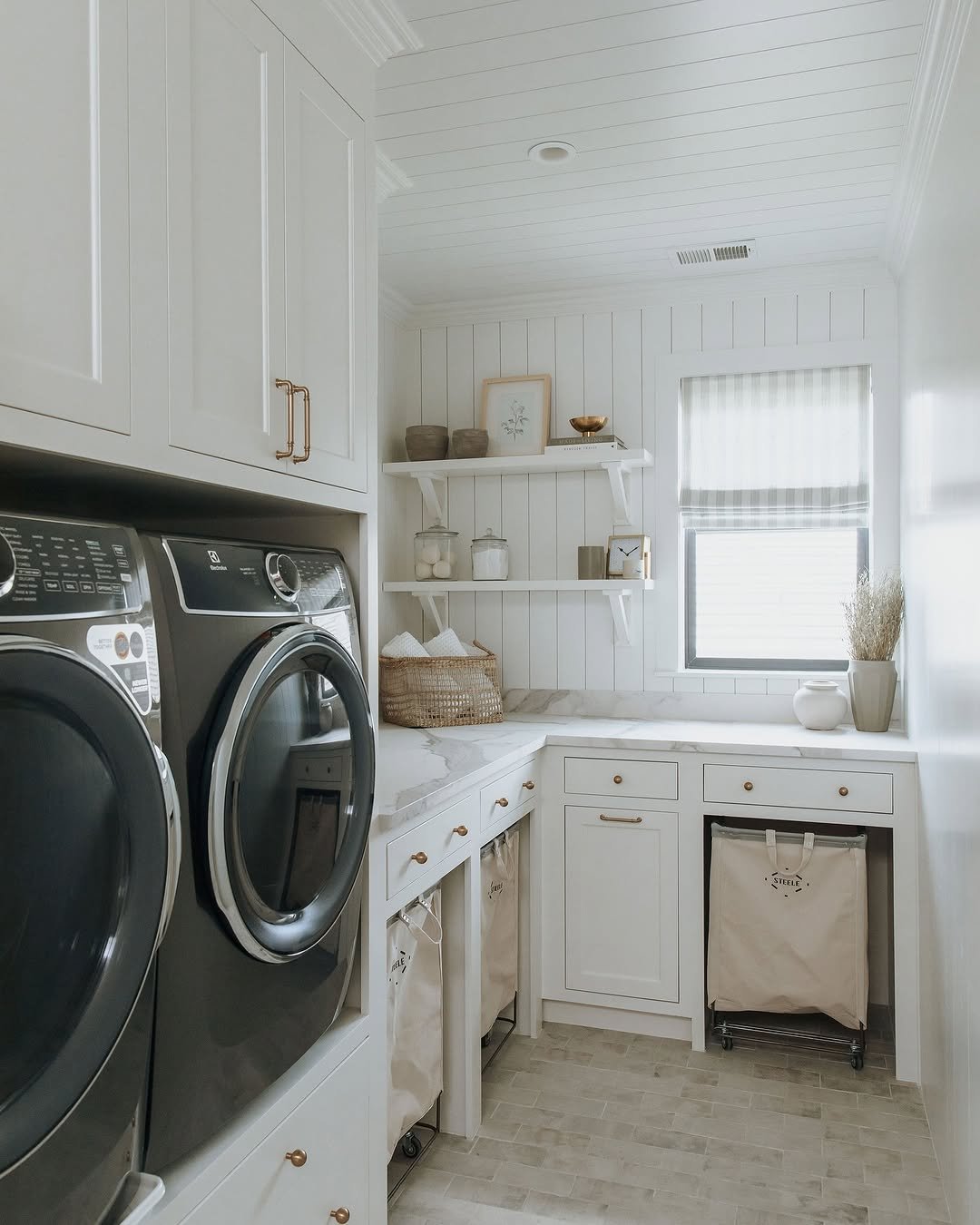 Who knew a laundry room could feel this serene. Crisp cabinetry, soft marble surfaces, and those tucked-away linen bins make everything feel quietly organized.