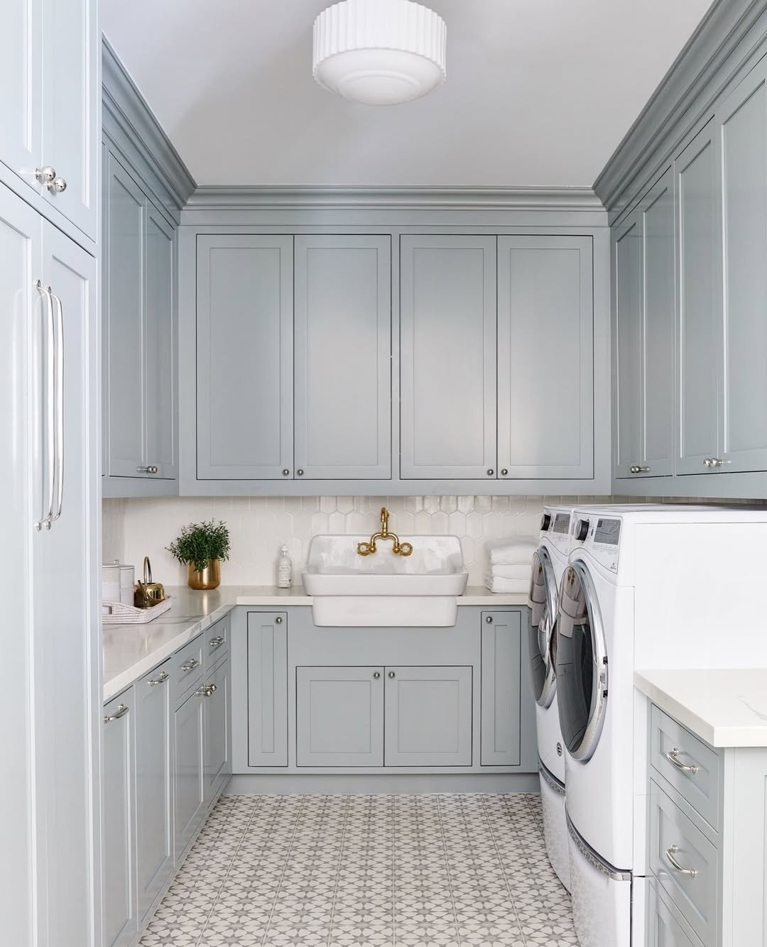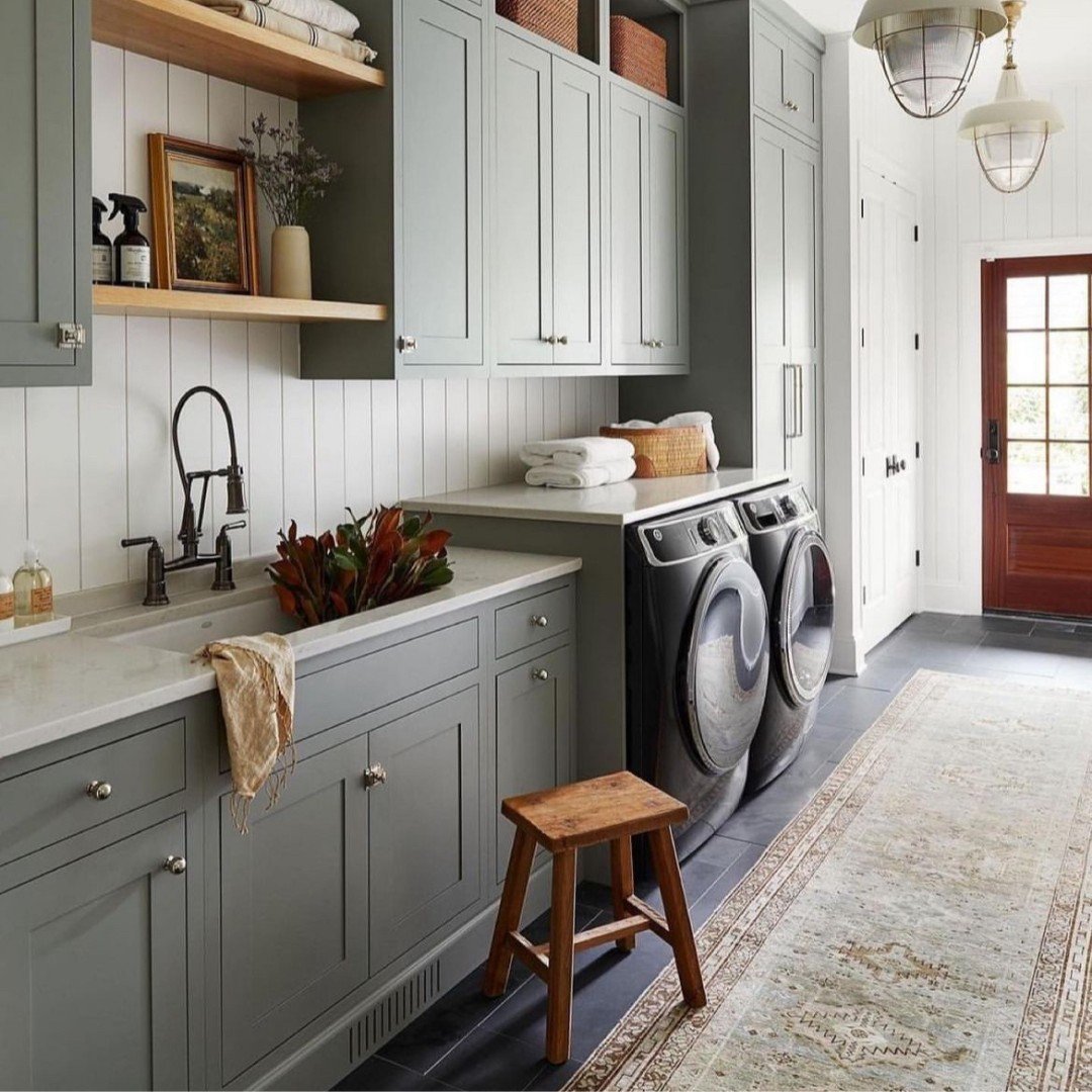 This isn’t just a laundry room, it’s a whole moment. Soft sage cabinetry, clean countertops, and thoughtful storage create a space that feels calm and pulled together.