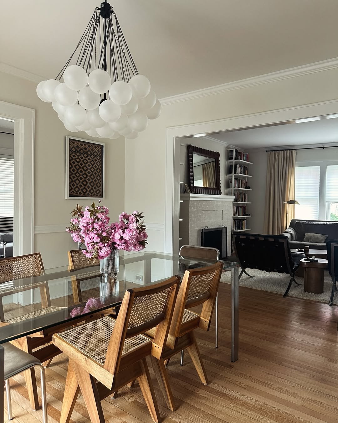 There’s a freshness here that feels almost effortless. The glass table, woven chairs, and soft natural light create a space that feels open and quietly styled.
