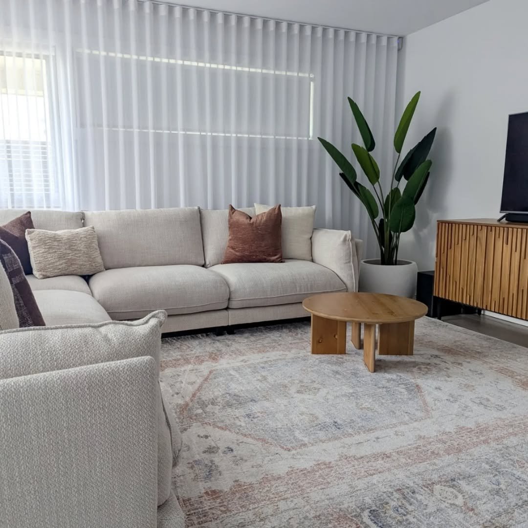 There’s an ease to this room that feels instantly welcoming. Soft upholstery, sheer curtains, and a grounded rug create a space that feels open but still anchored.