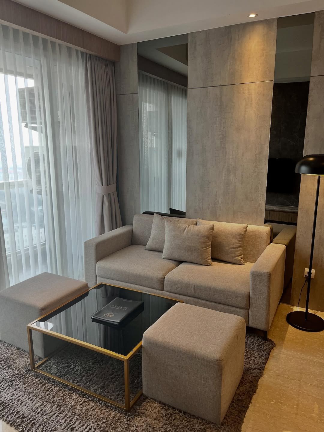 This space shows how clean design can still feel warm. Neutral tones, structured furniture, and soft lighting create a small living area that feels intentional and composed.