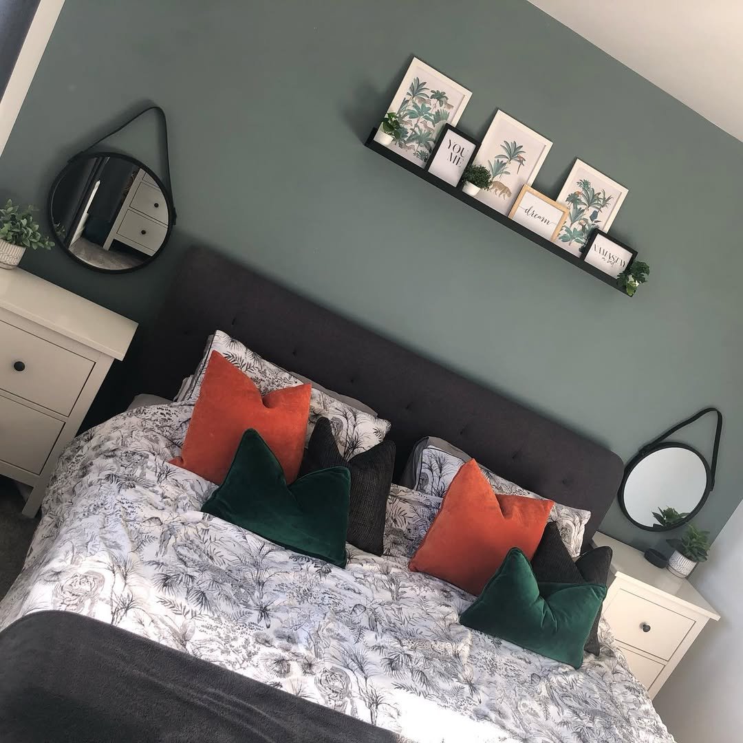 This one takes a slightly bolder turn while still keeping things clean. The deep green wall grounds the space, while crisp bedding and structured pillows keep everything feeling composed.