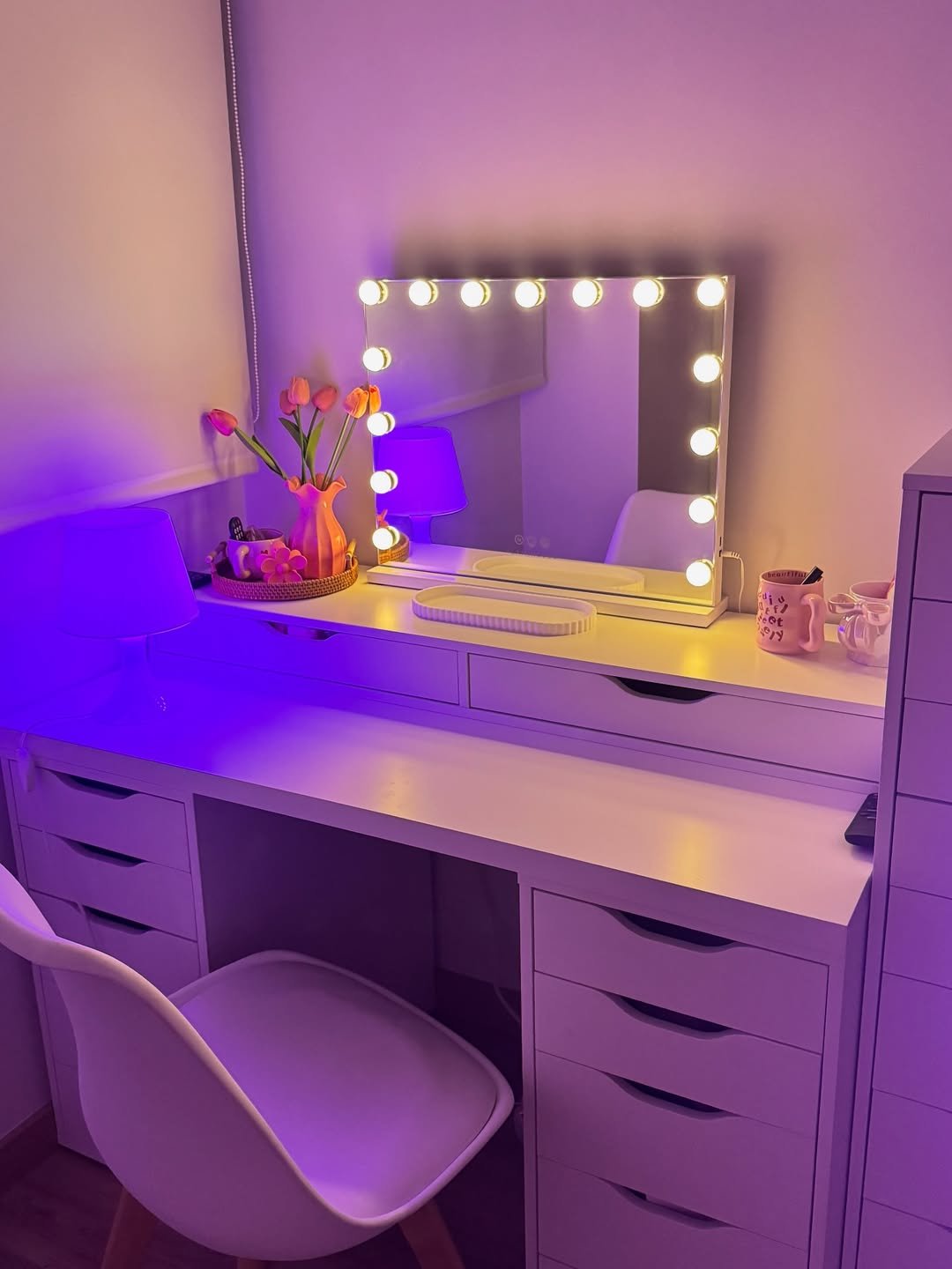 This setup leans into a different kind of clean aesthetic, one that feels personal and a little playful. The lit mirror and soft purple glow create a space that feels ready for quiet self-care moments.