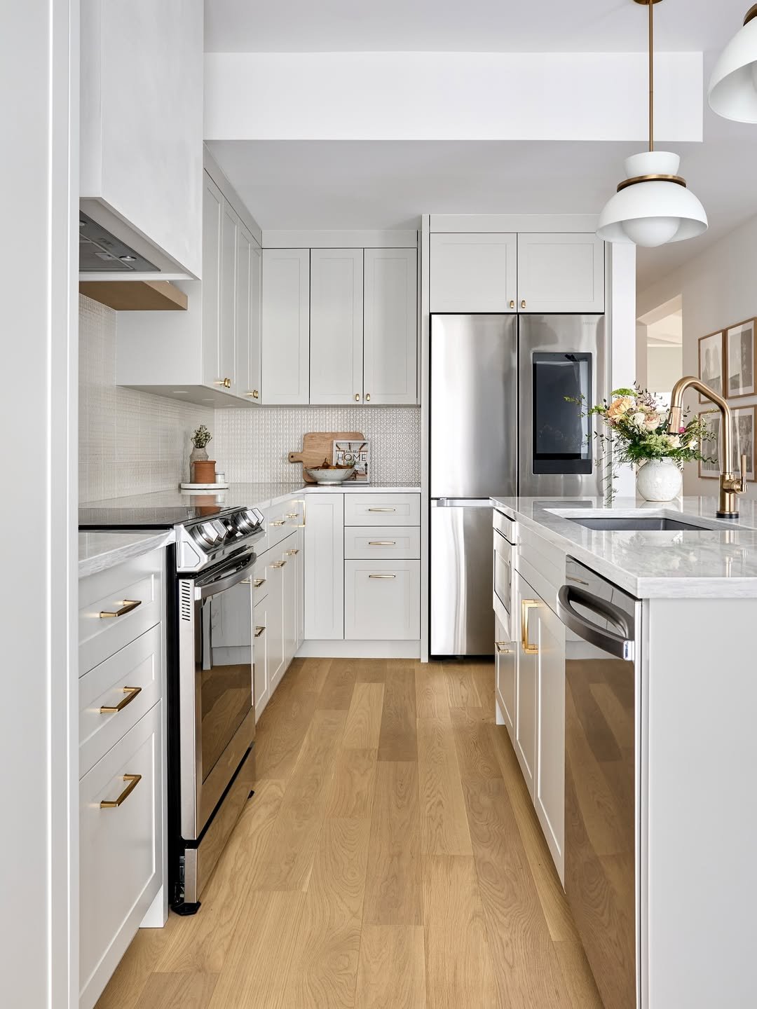 This kitchen leans into that polished, almost tailored look. Light cabinetry, warm wood floors, and brushed gold hardware create a space that feels refined without being too precious.