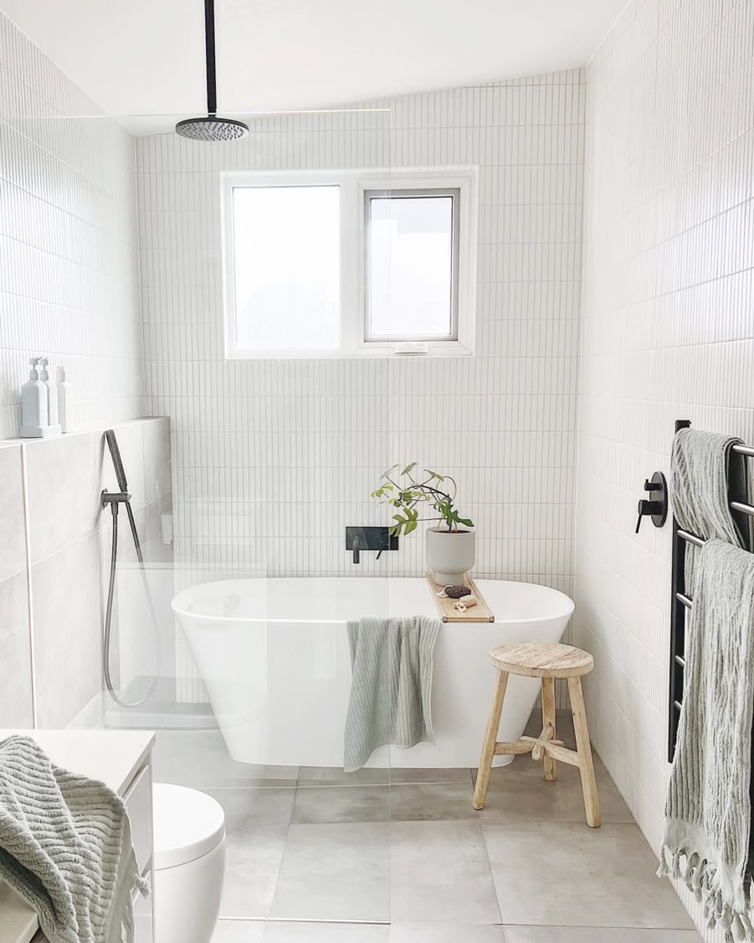There’s a stillness in this space that feels almost meditative. Clean white tiles, a simple tub, and soft textiles create a look that feels fresh without trying too hard.