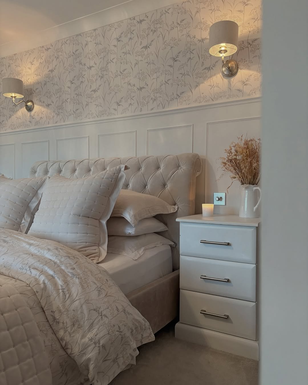 There’s a quiet romance to this space that feels almost cinematic. The tufted headboard, delicate wallpaper, and warm wall sconces create a soft, cocooned feeling, like the room gently winds down with you at the end of the day.