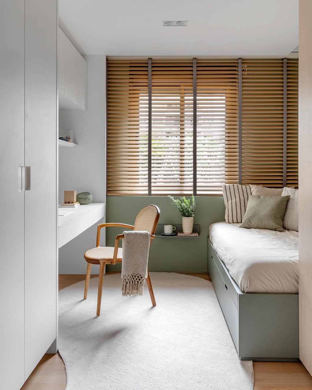 There’s something so thoughtful about this layout. The built-in bed, low profile storage, and that muted green backdrop create a space that feels both compact and calming.