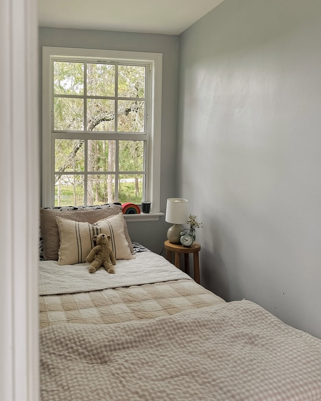 This corner feels like a gentle pause in the day. Light bedding, soft textures, and that window framing the outside greenery create a space that feels both cozy and open.