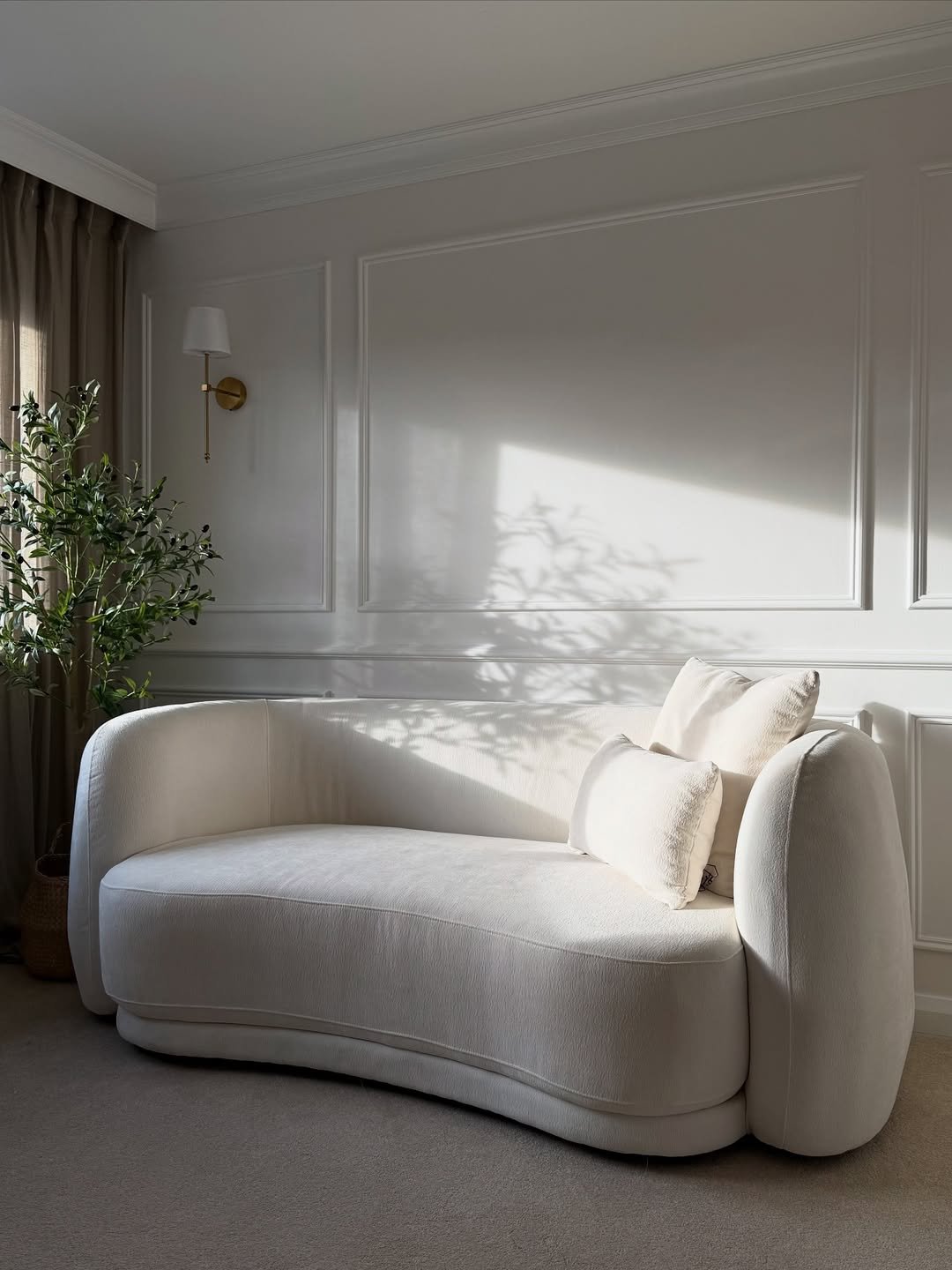 This room feels like a breath held in the most peaceful way. The curved sofa, the paneled walls, and that gentle wash of sunlight create a softness that feels intentional and serene.