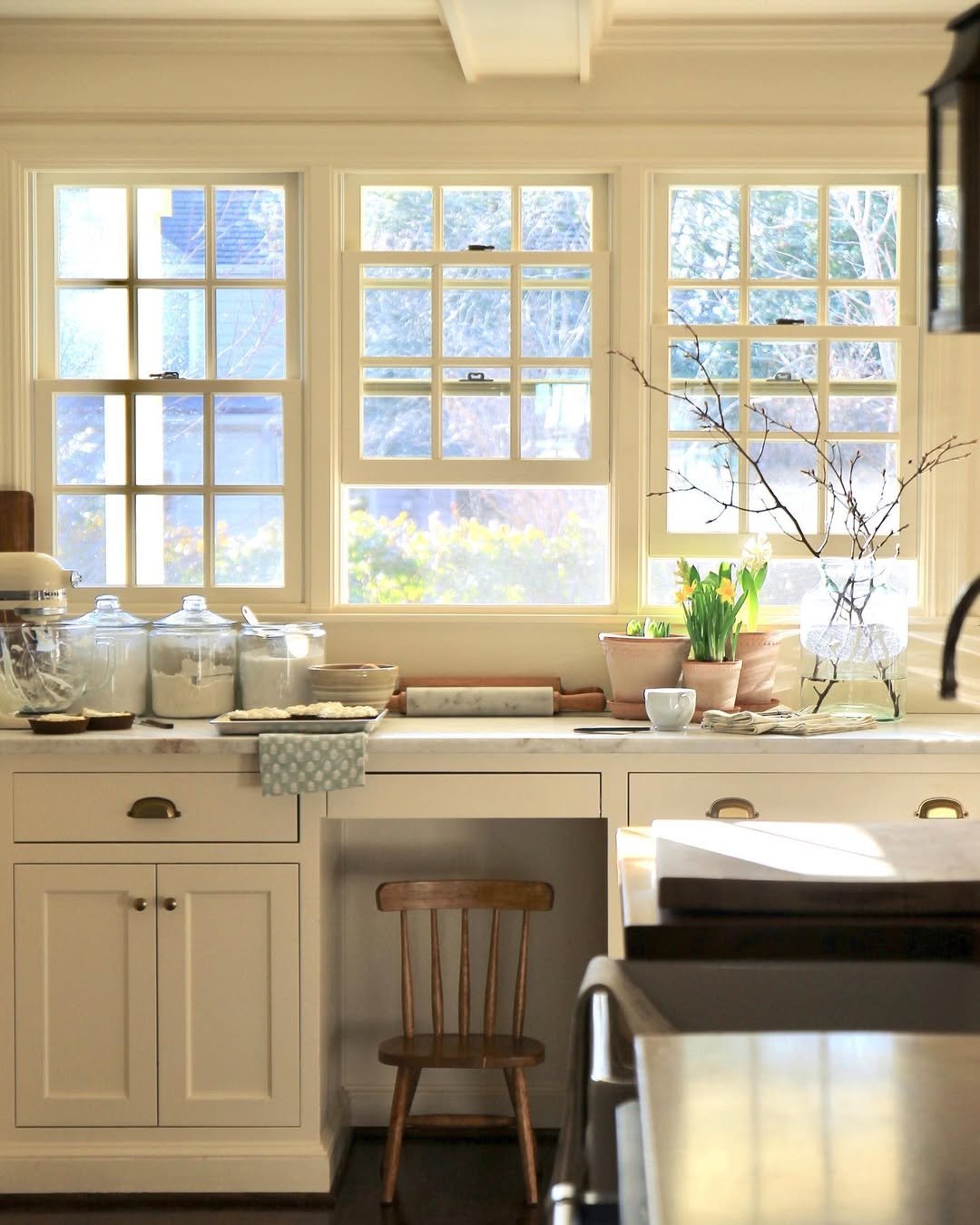 It’s not just clean, it’s alive in a quiet way. A simple chair tucked in, a few stems by the window, and suddenly the space becomes less about cooking and more about living.