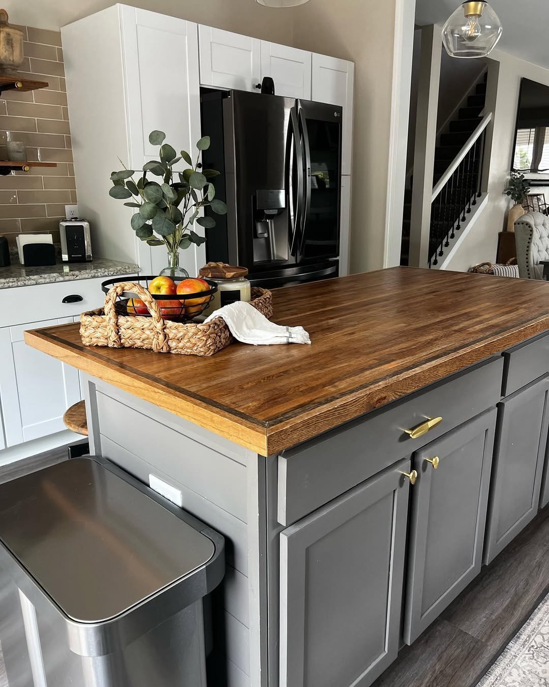 There’s something grounding about this space that feels instantly lived-in, in the best way. The rich wood countertop softens the crisp cabinetry, while small details, like the woven tray and fresh fruit, bring a quiet rhythm to the room.