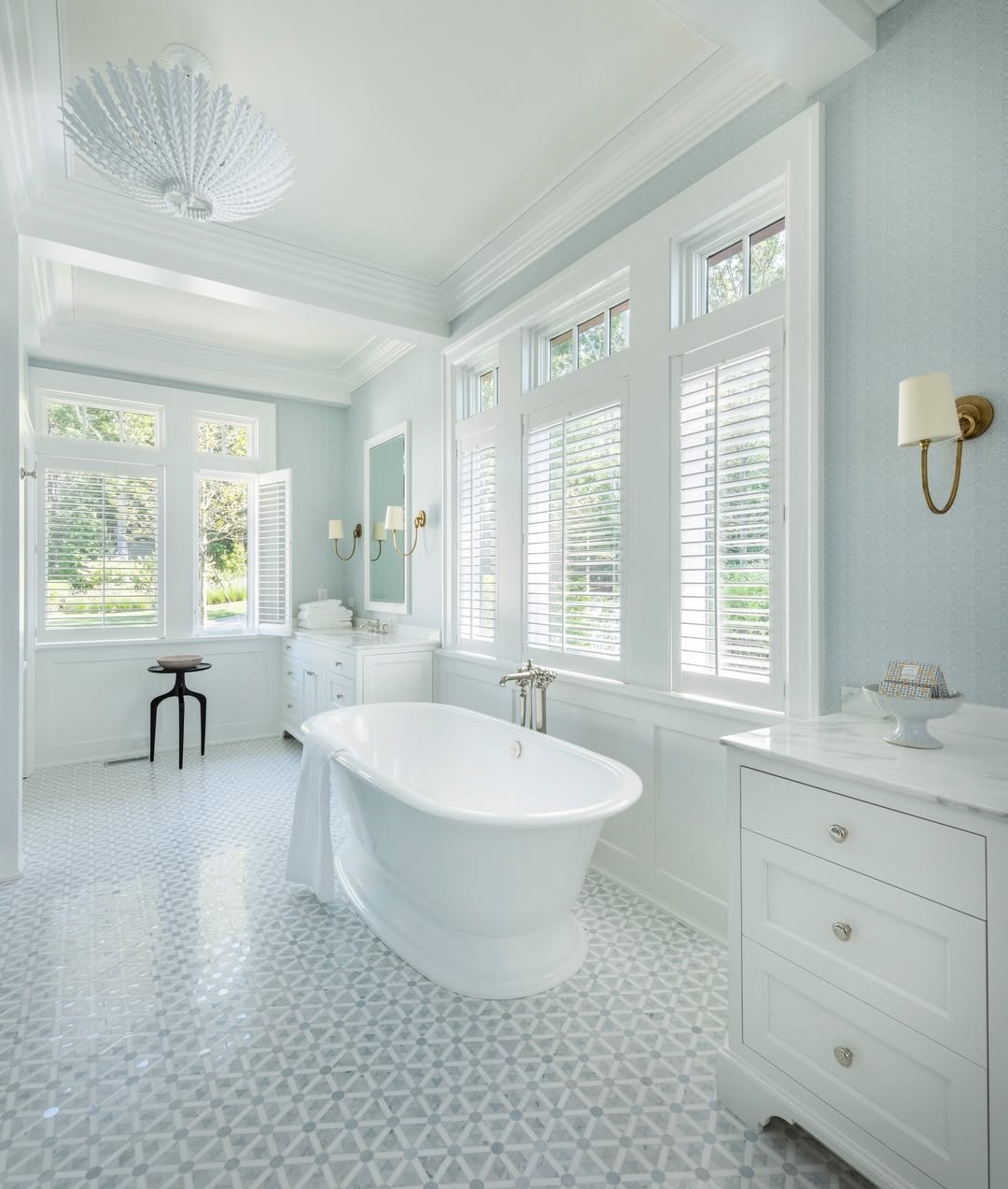 This space is basically sunshine in bathroom form. The pale blue tones, tons of windows, and that freestanding tub create a light, open feel that’s hard to beat.