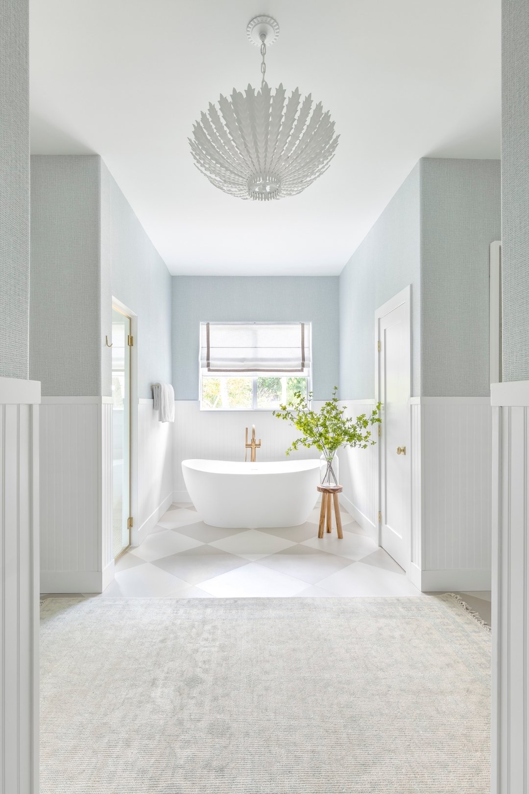 There’s something about that freestanding tub sitting under soft natural light that just hits differently. The pale blue walls and clean lines make everything feel open and calm.