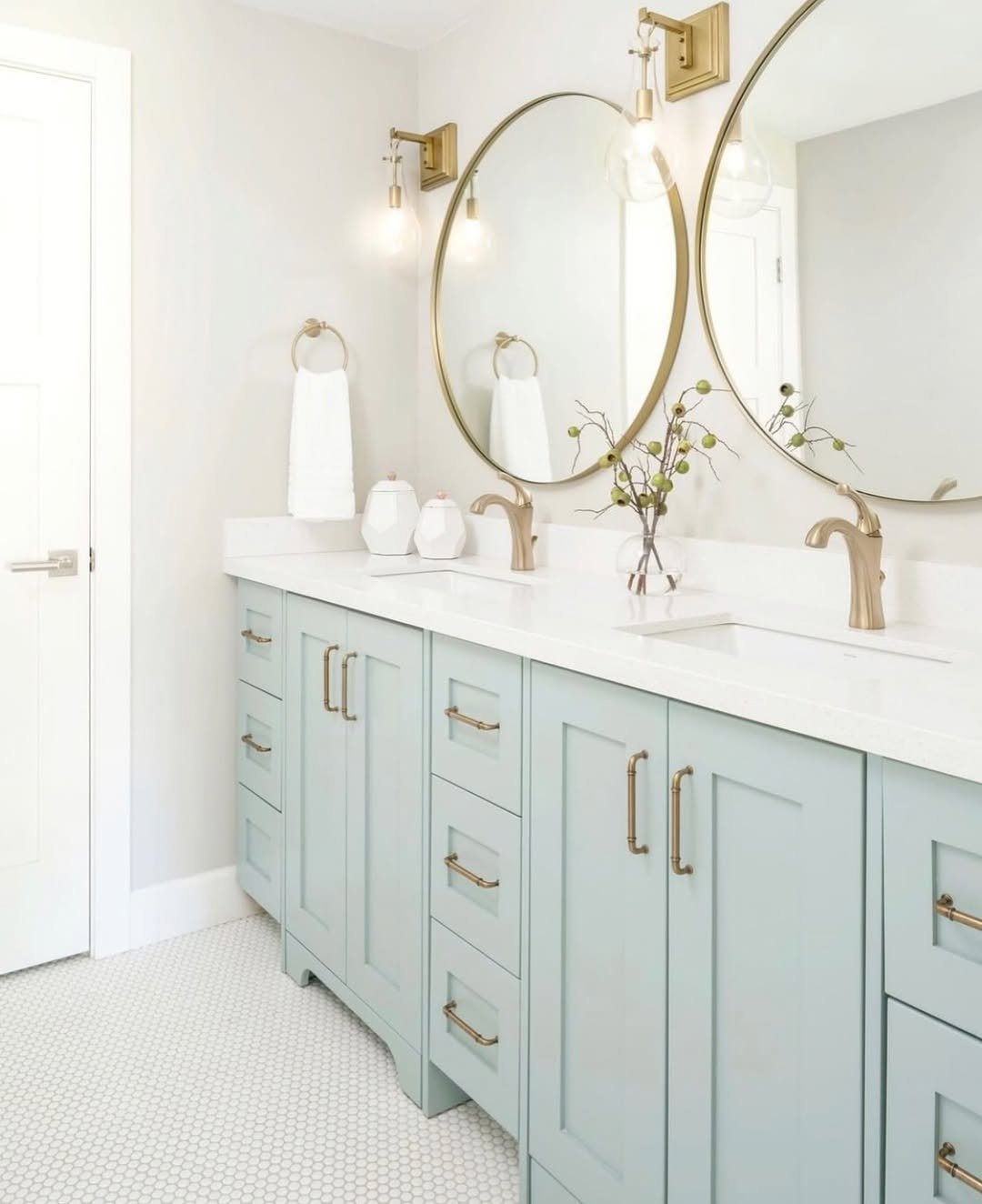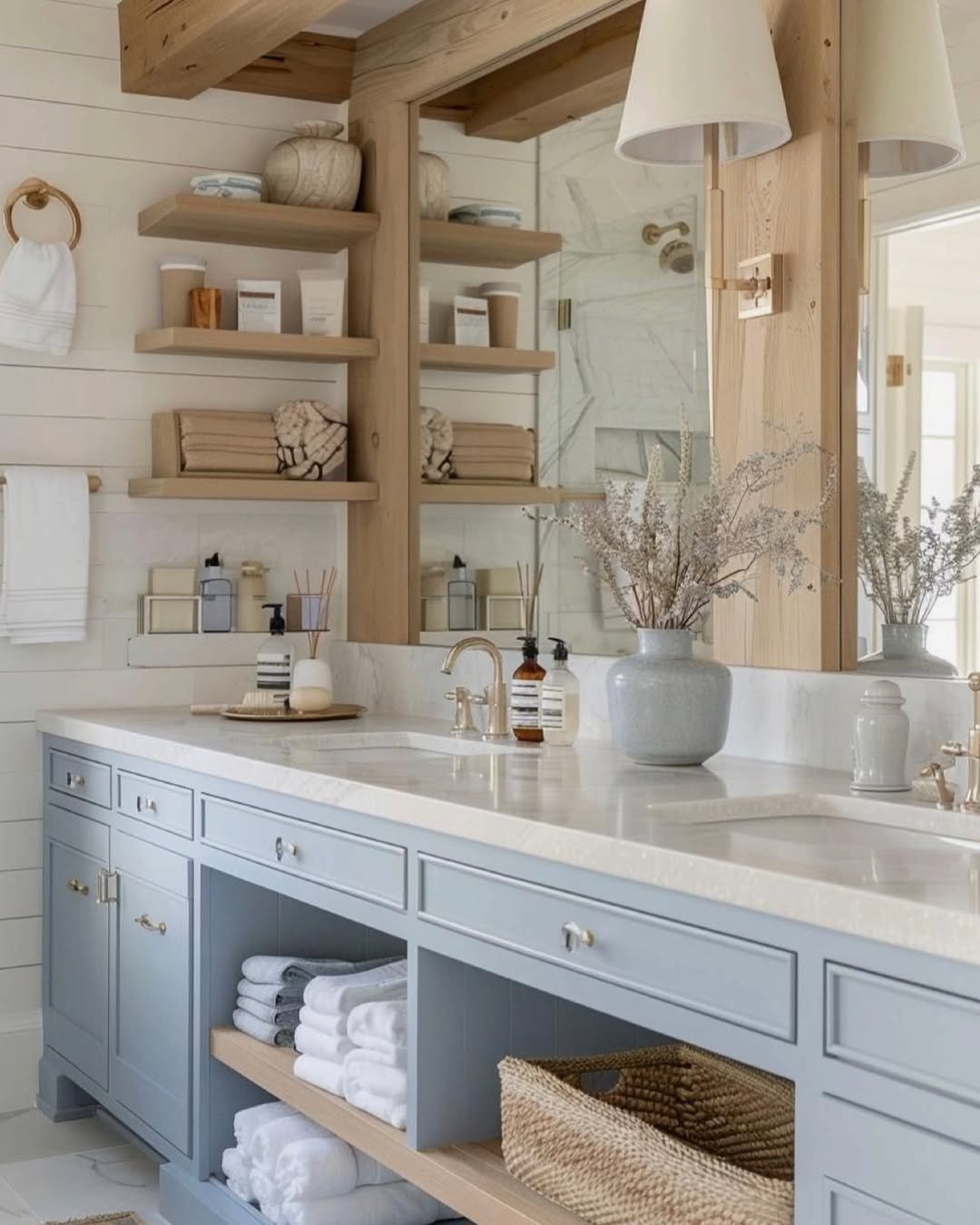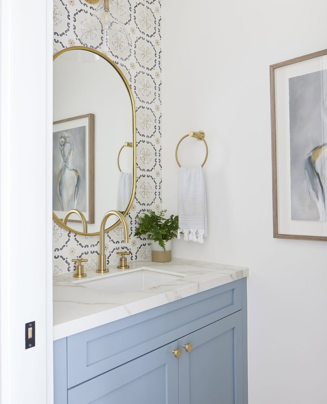 This one just feels happy. The soft blue vanity, warm brass fixtures, and that round mirror combo create a space that’s equal parts fresh and inviting.