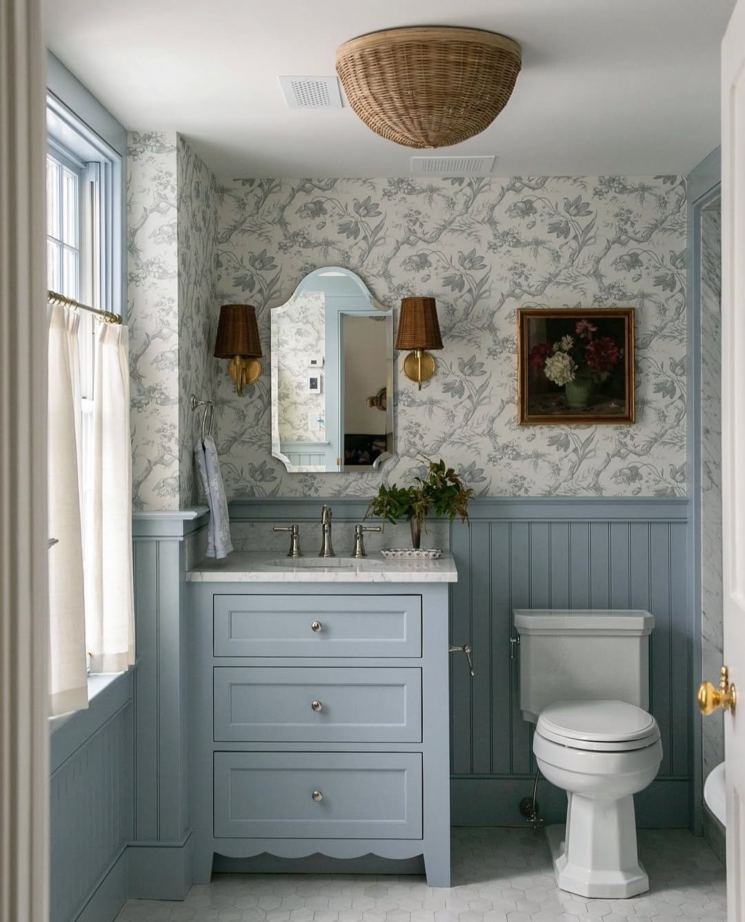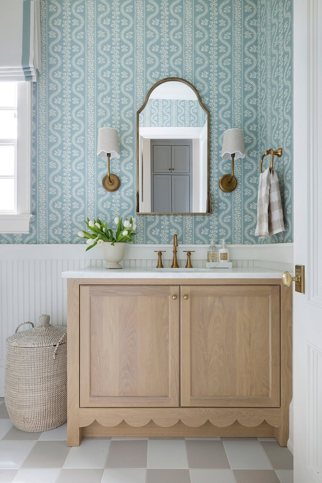 This one leans into pattern—but in a very polished way. That soft blue wallpaper adds texture and interest while still keeping things light and coastal.
