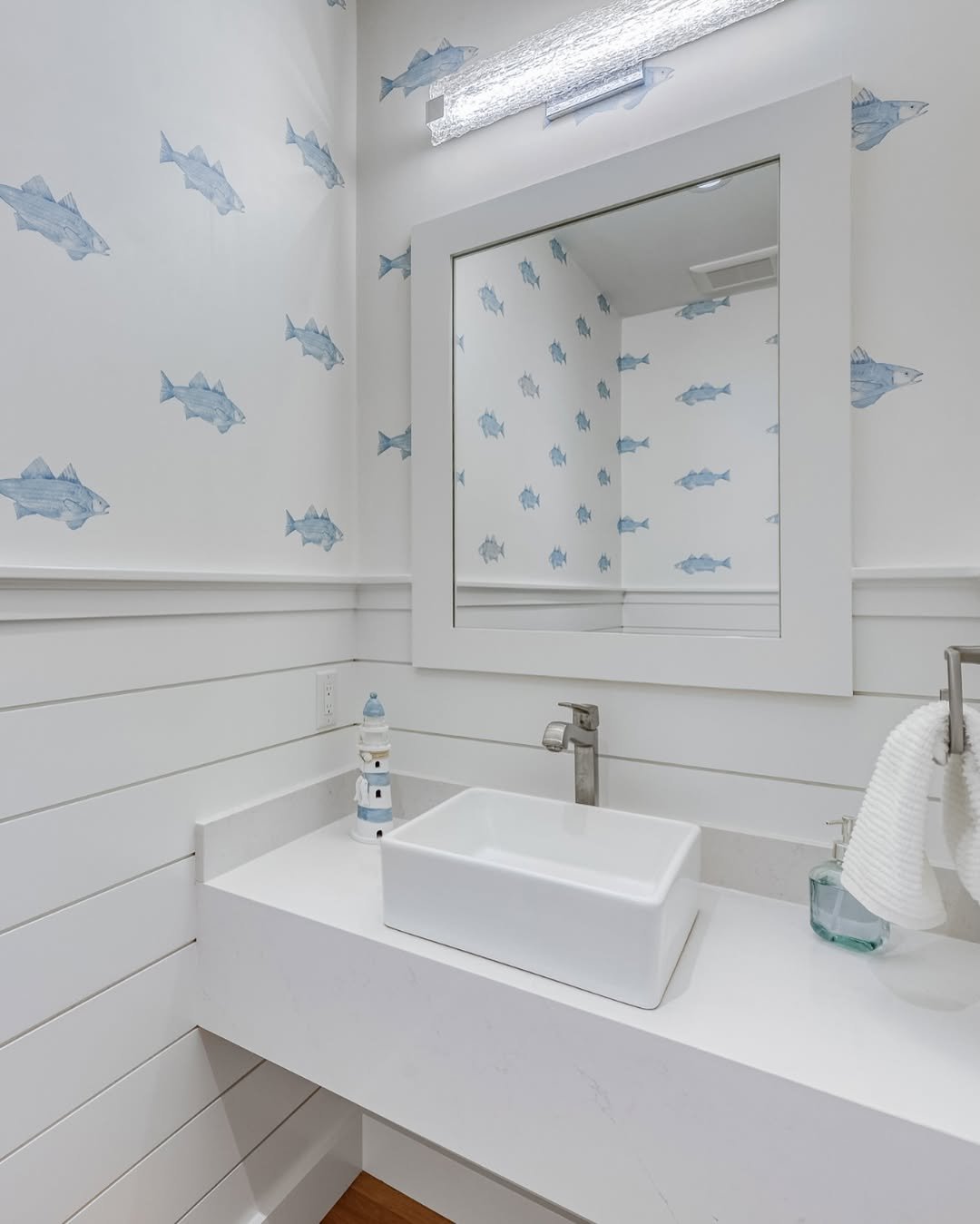 This one’s fun. The fish wallpaper adds a playful touch that doesn’t take itself too seriously, but still fits the coastal theme perfectly.