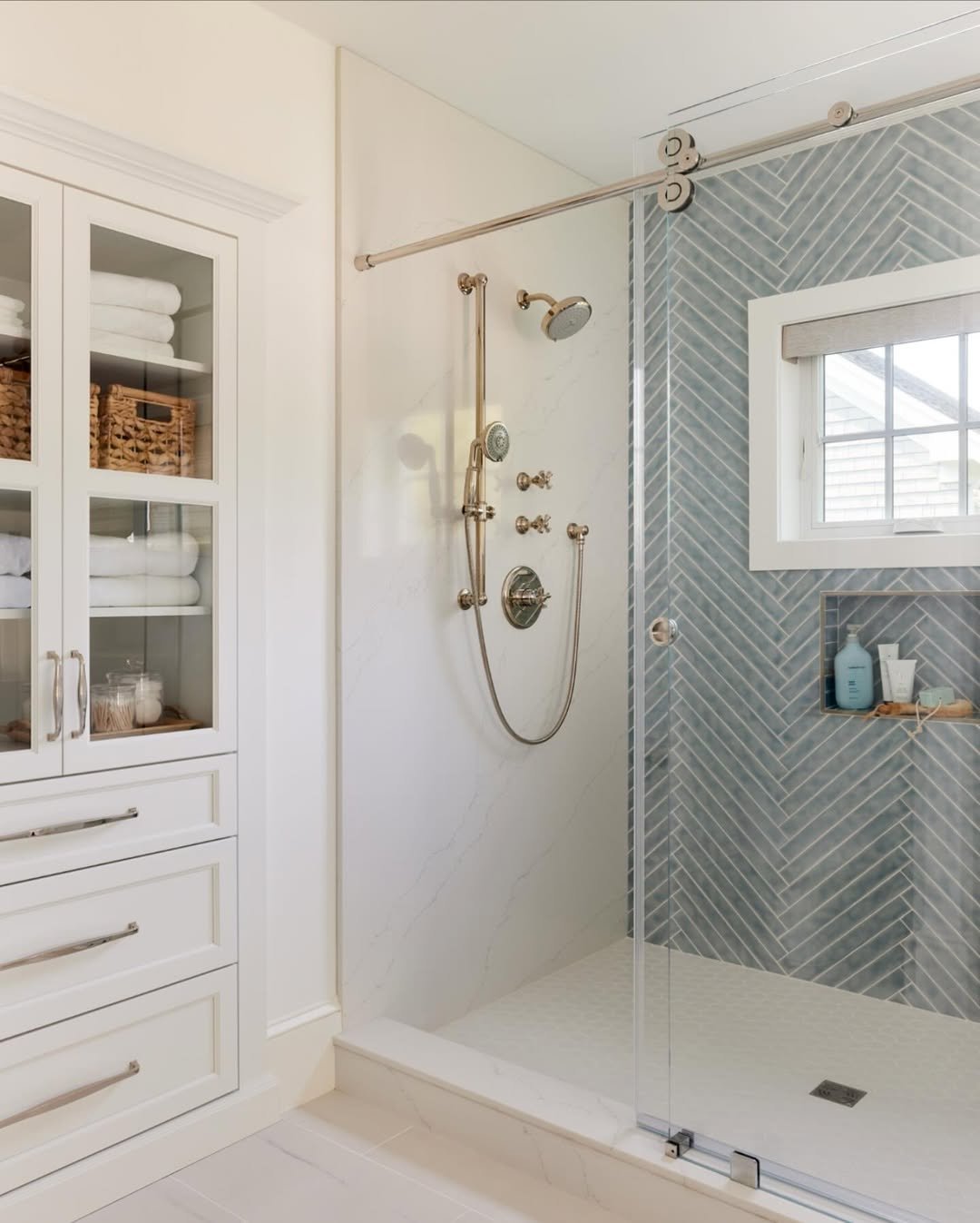 That soft blue herringbone tile is doing all the talking here—and honestly, it deserves the spotlight. It adds just enough movement to keep things interesting while still feeling calm and spa-like.