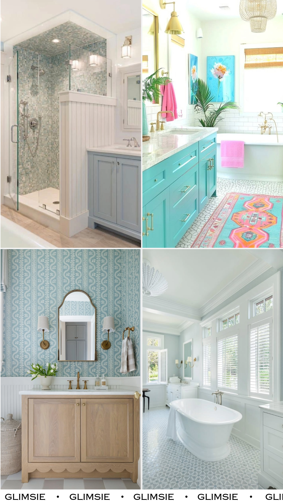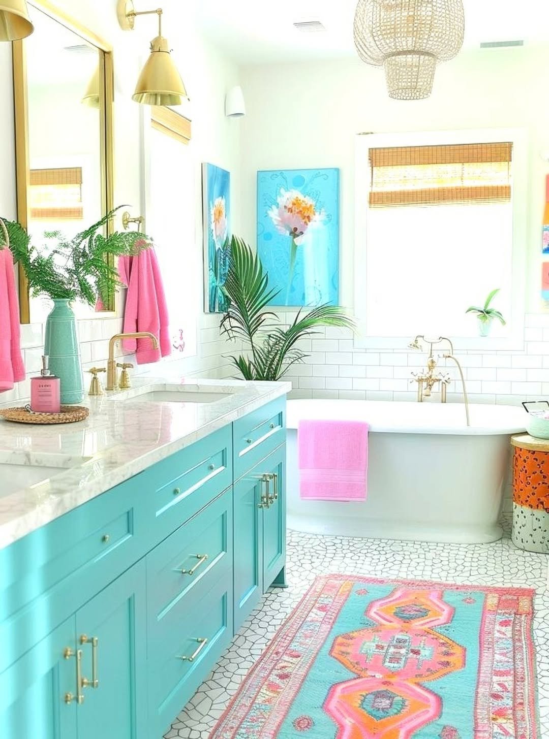 This one feels like a beach vacation that decided to stay forever. The turquoise vanity, pink accents, and playful rug bring in that sunny, carefree energy you usually only get seaside.