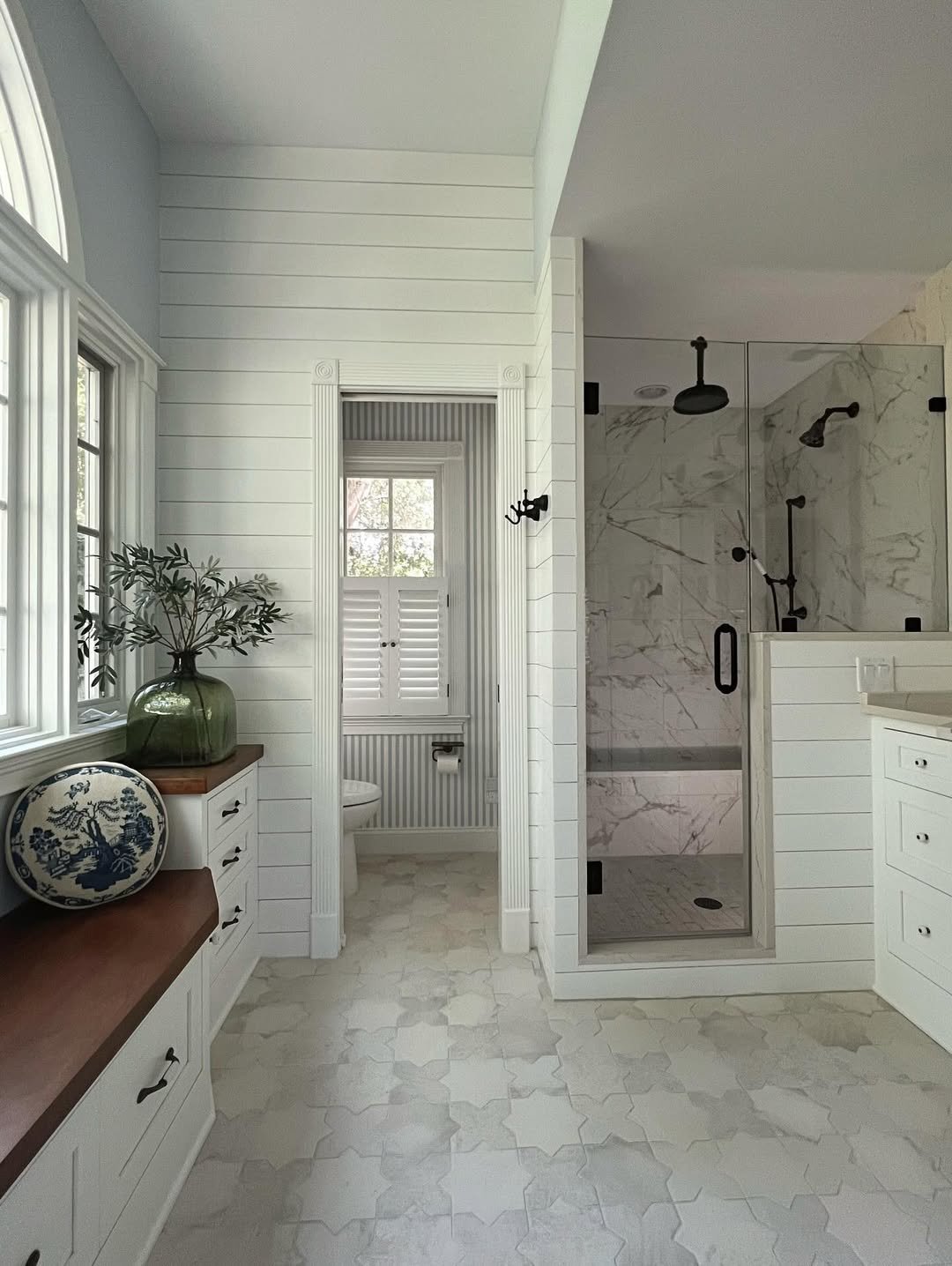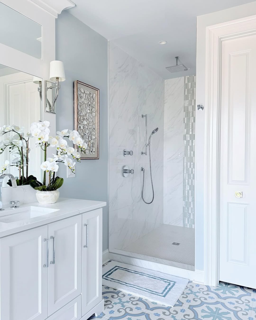 The mix of marble, soft wall color, and patterned flooring gives it depth without overwhelming the space. It’s calm, but not boring—which is a tricky line to walk.