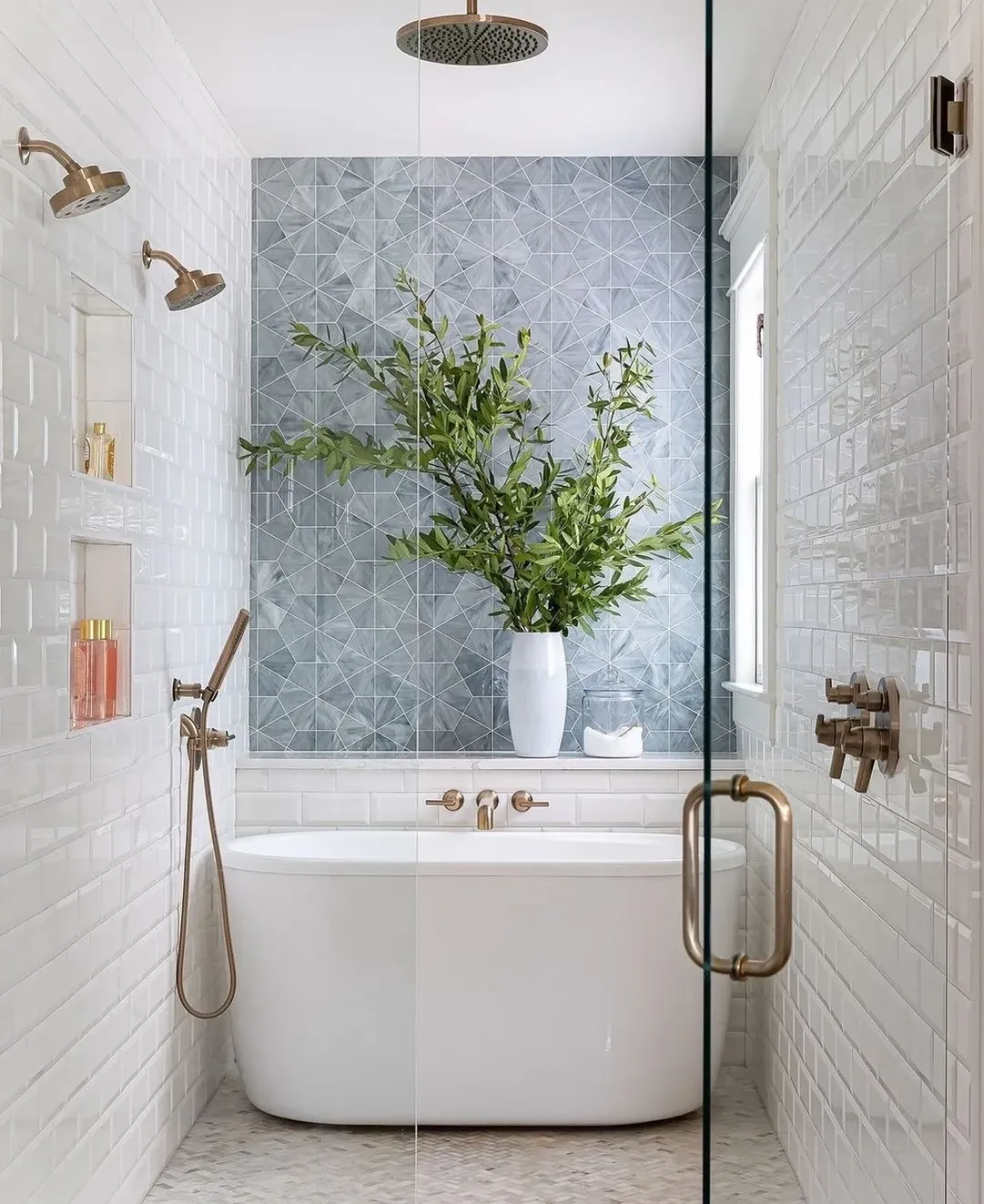 This layout feels intentional in the best way. The tub framed by that geometric blue tile wall instantly pulls your focus, almost like a piece of art.
