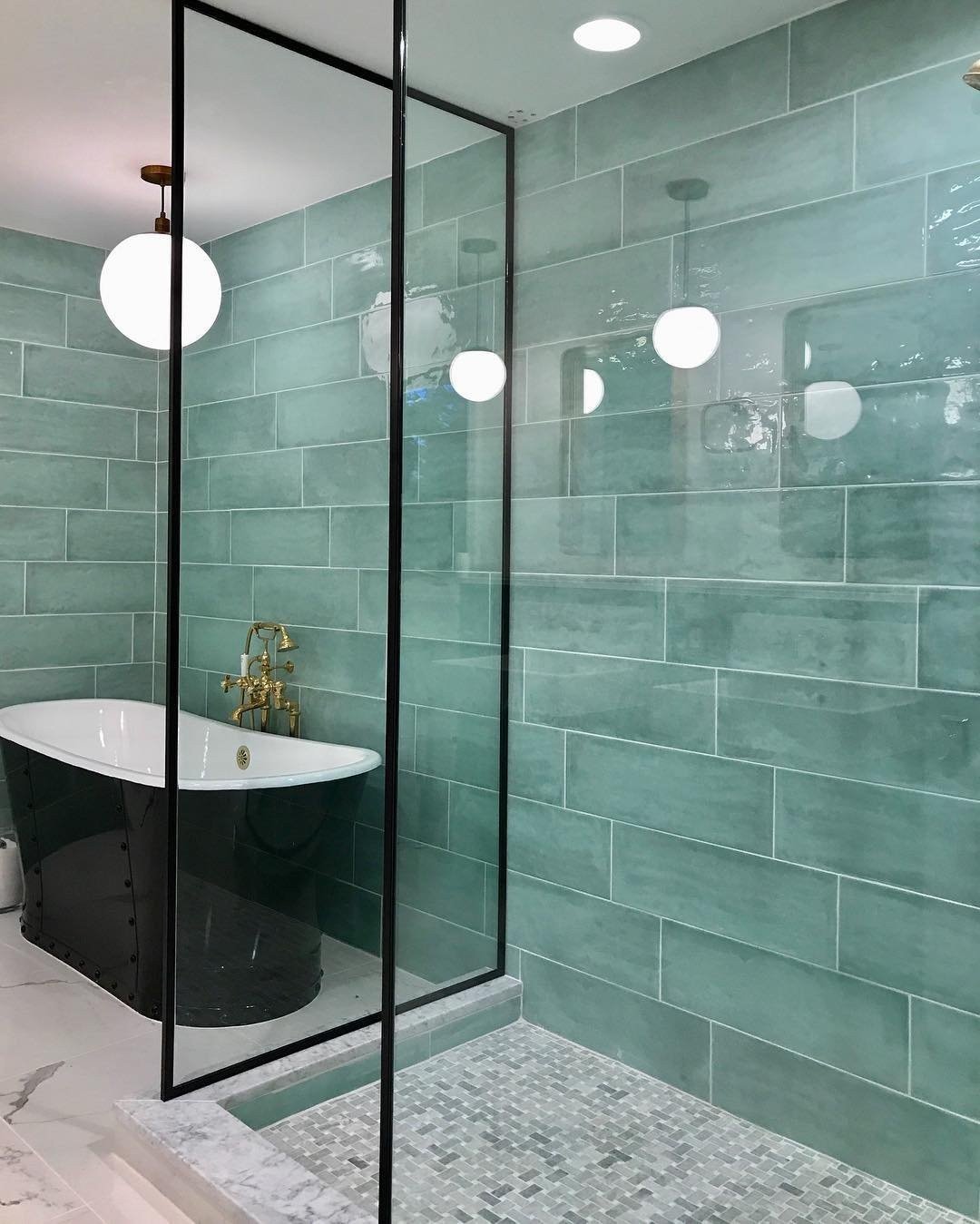 That glossy aqua tile instantly sets the mood. It’s bold without being loud, and the way it reflects light makes the whole space feel alive.