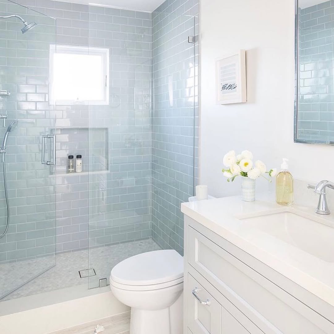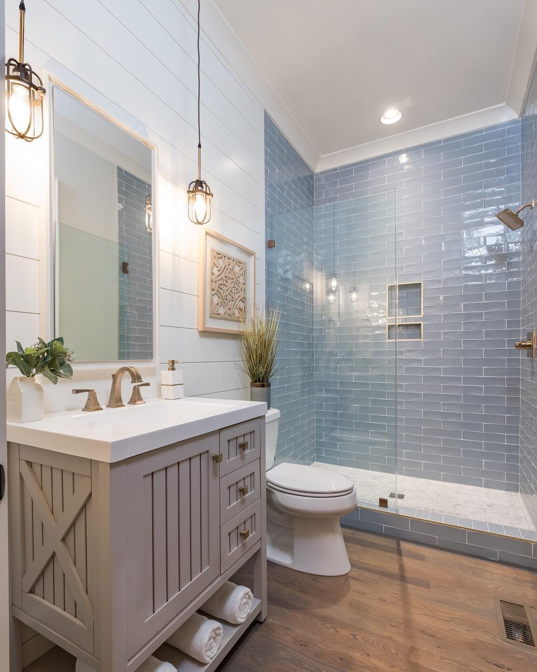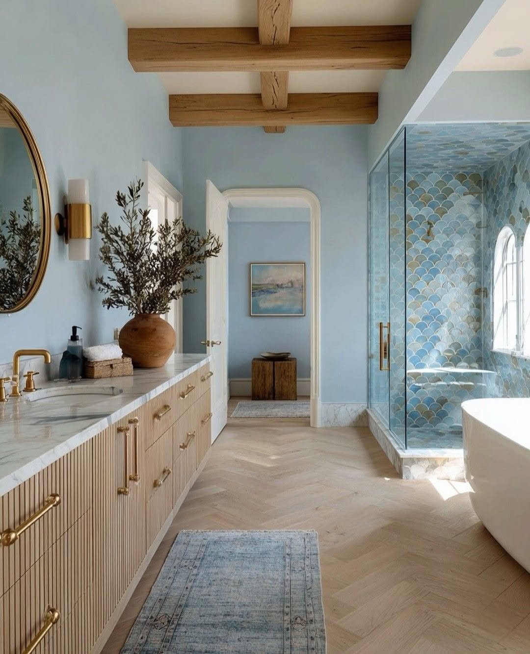 Muted blue tiles and warm brass accents? That’s a combo that rarely misses. It feels soft, calm, and just slightly elevated.