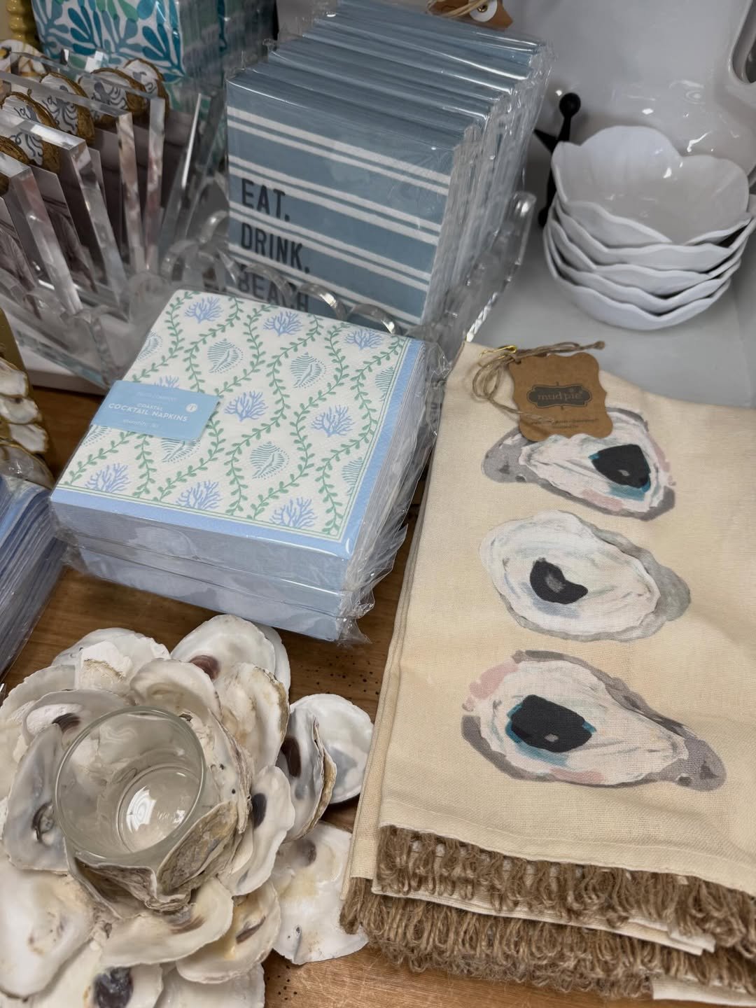 These small accents tell a whole story. Striped napkins, oyster illustrations, and soft blues come together in a way that feels lighthearted and easy.