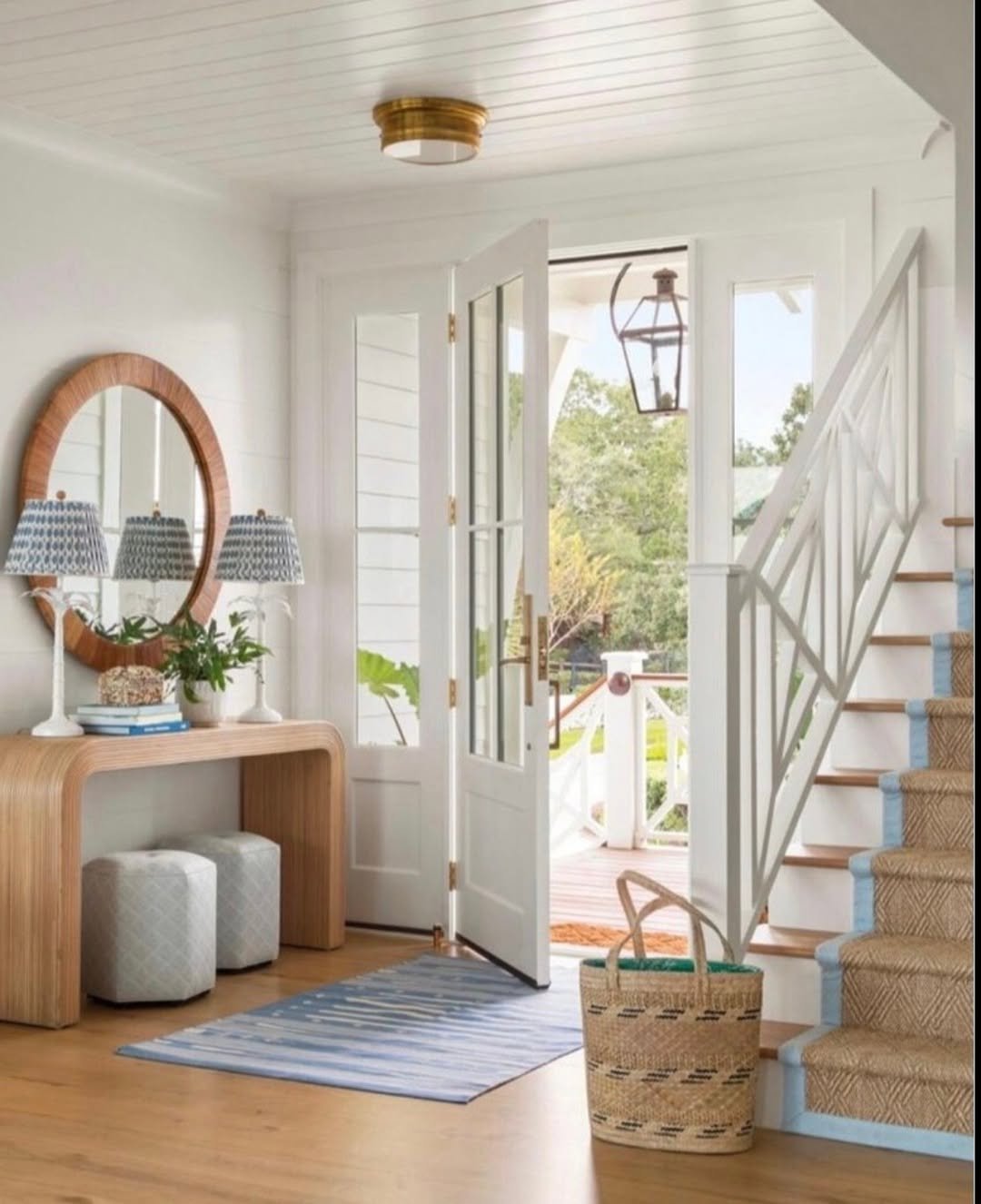 The styling stays simple but thoughtful. A striped rug, a woven tote, and a rounded mirror add just enough personality without disrupting that airy, come-and-go ease.