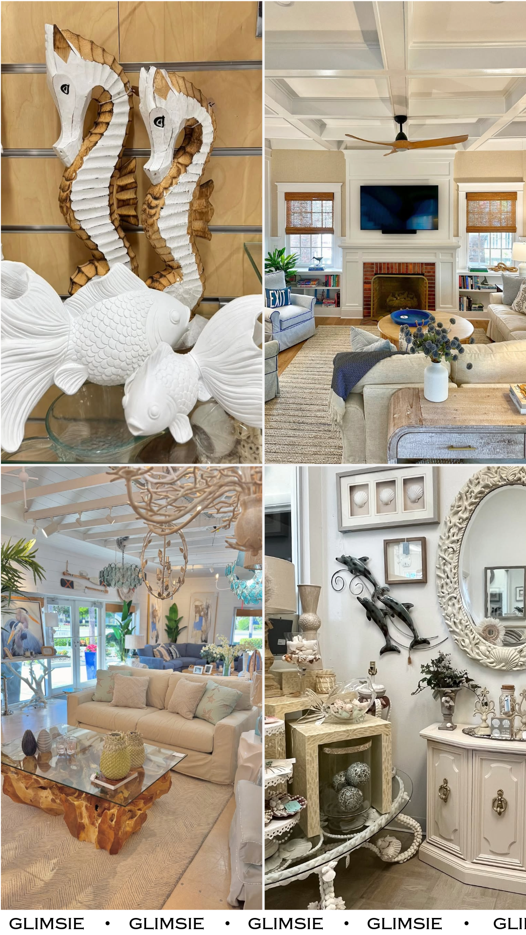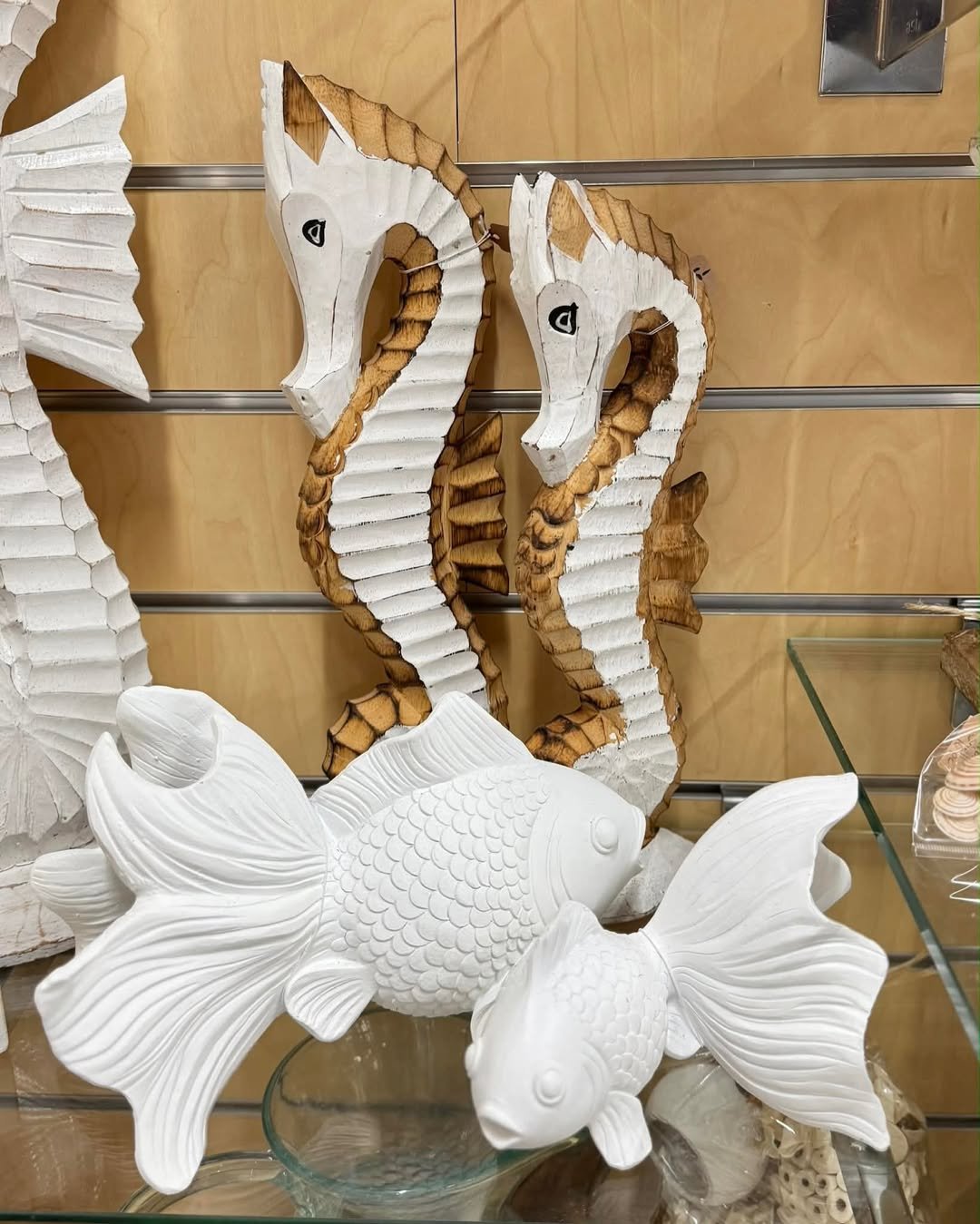 This little vignette leans into playful coastal charm. Seahorses, textured fish, and layered whites create a display that feels almost like a seaside treasure shelf.