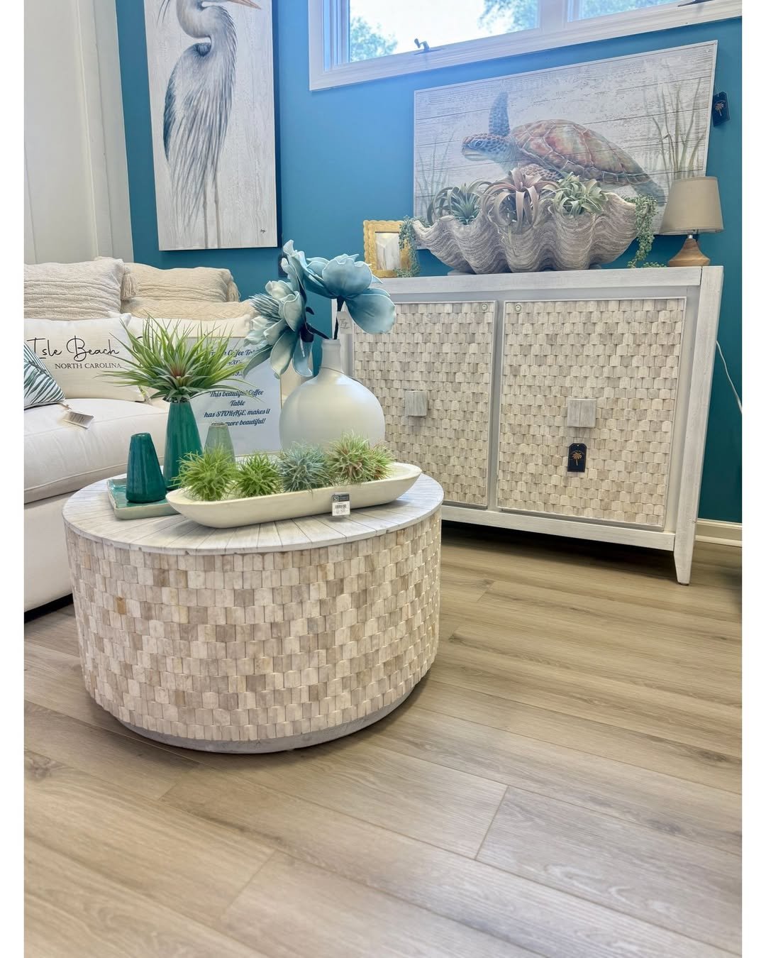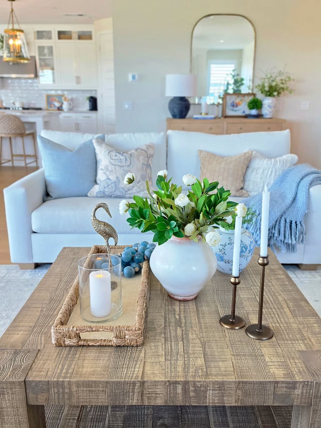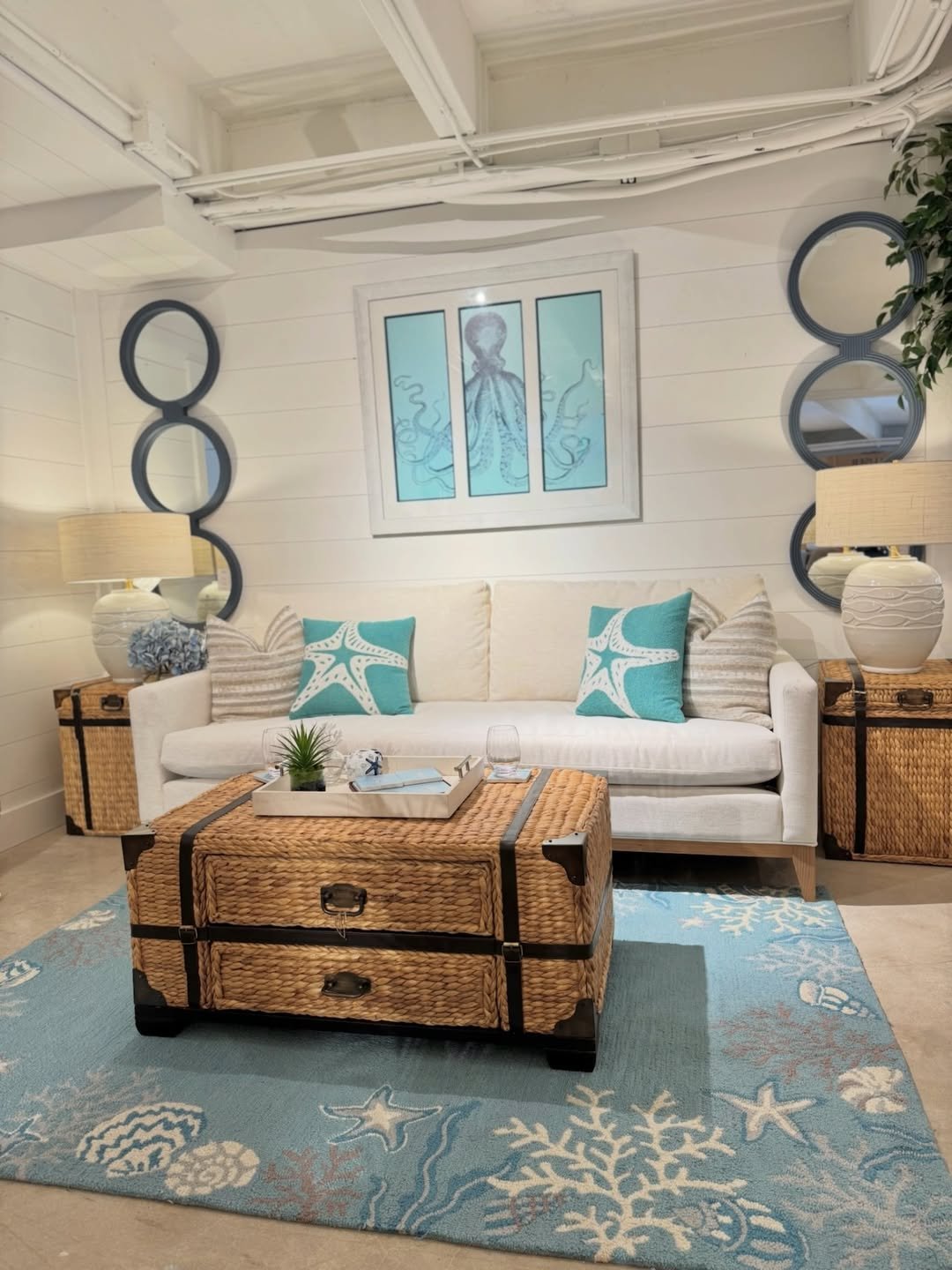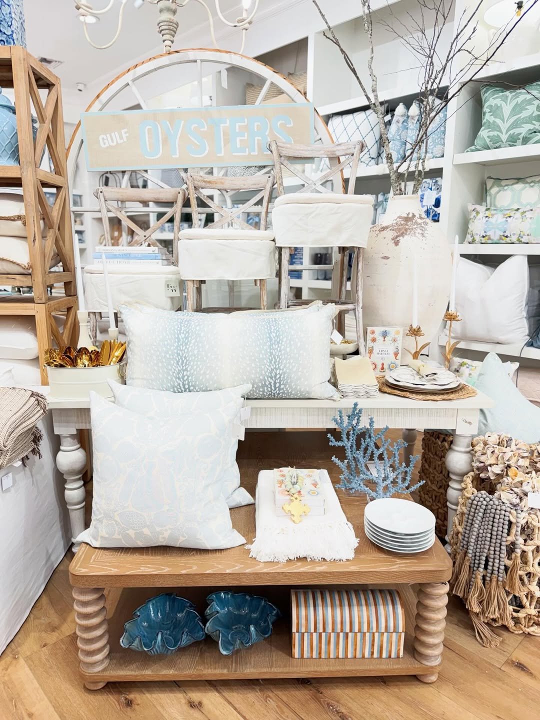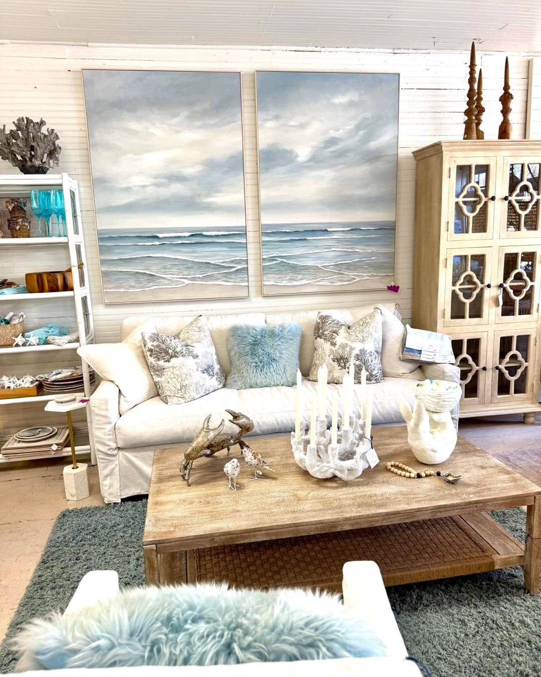 This setup feels like wandering into a seaside shop you never want to leave. Soft blue pillows, oyster-toned accents, and warm wood pieces create a layered look that feels equal parts curated and relaxed.