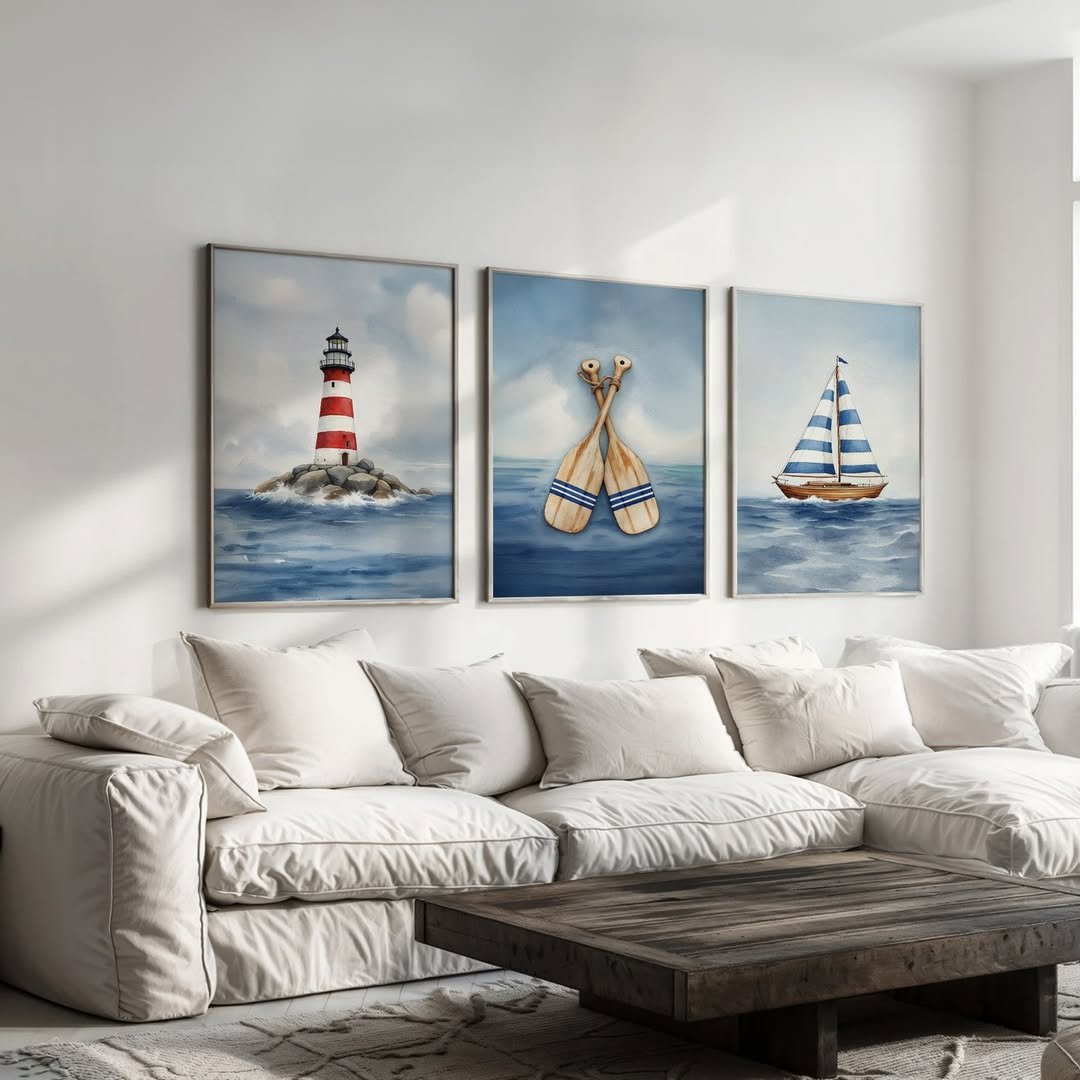 There’s something about a perfectly spaced trio that instantly elevates a room. The lighthouse, crossed oars, and striped sailboat feel classic, but the soft painterly style keeps it from leaning too themed.