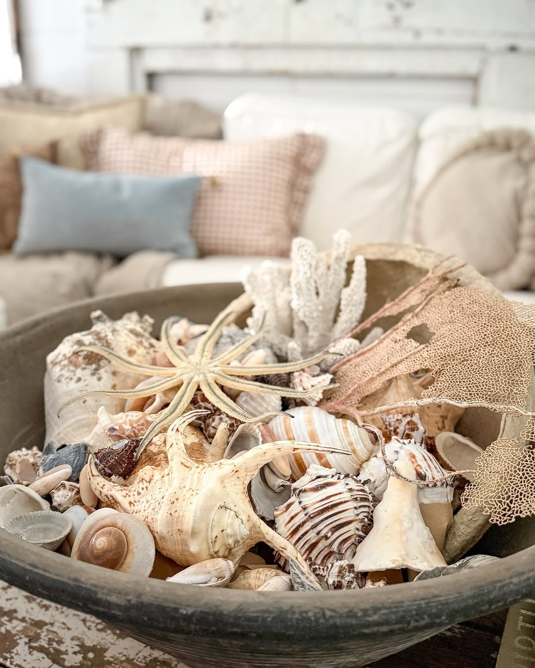 This bowl feels like a treasure trove from a long beach walk. Layers of shells, coral, and soft neutrals create a centerpiece that feels organic and personal.