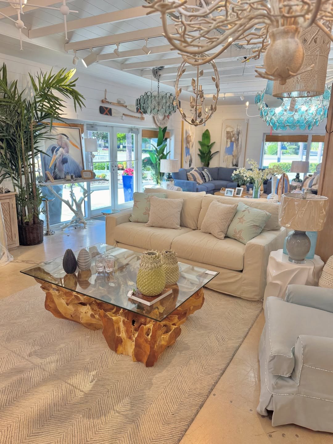 This space feels open, breezy, and full of life. Natural light, leafy greens, and soft upholstery create that indoor-outdoor feeling that coastal homes do so well.