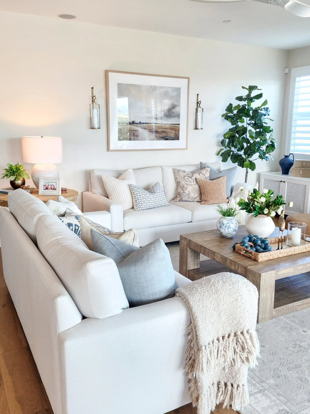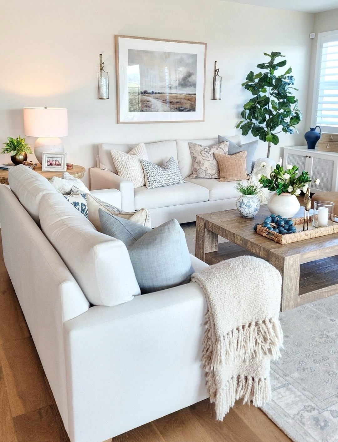 This space feels like a slow Sunday morning. Creamy sofas, layered pillows, and warm wood tones create that effortless comfort that doesn’t try too hard.