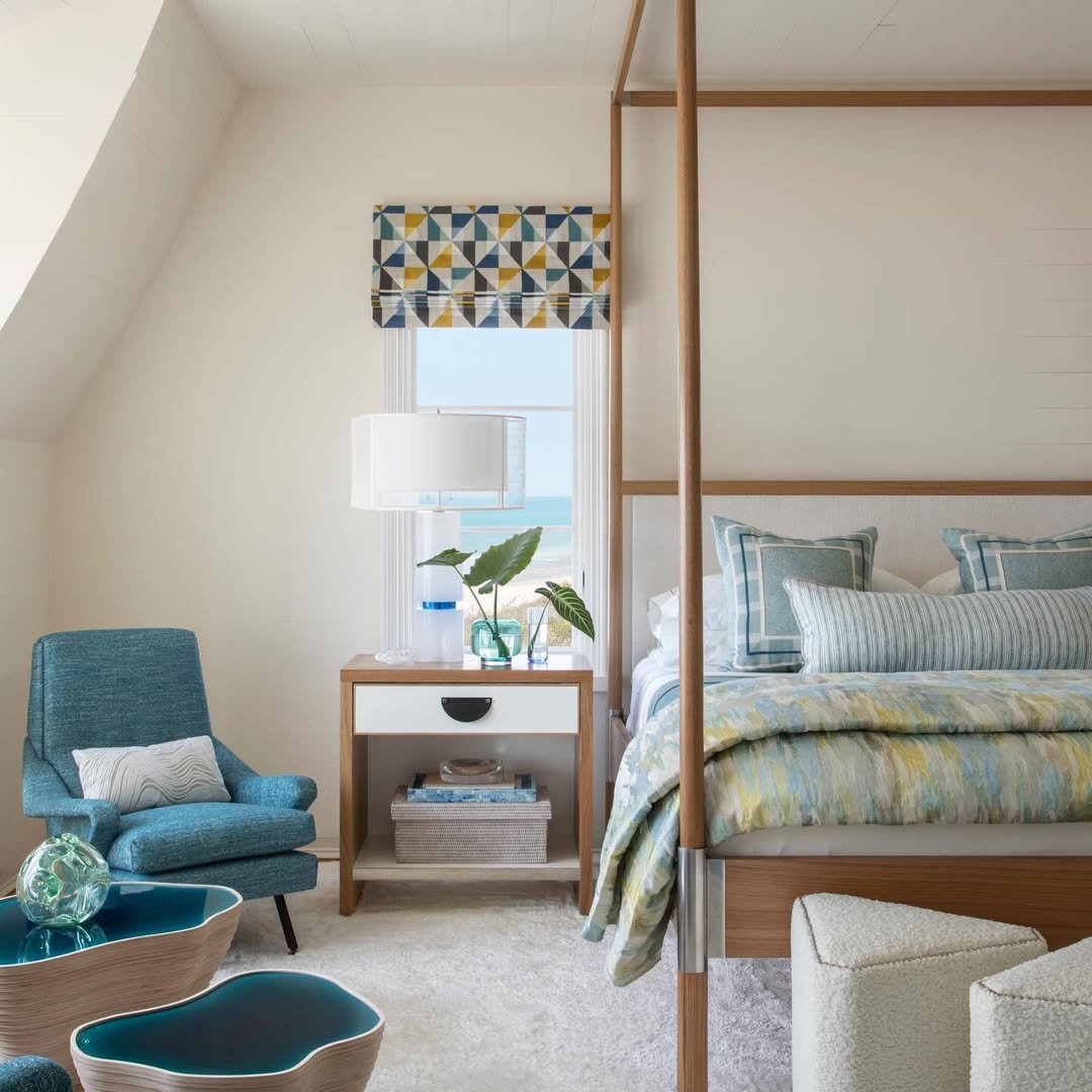 The mix of patterns stays gentle, nothing too bold, just enough variation to keep the eye moving. It’s a reminder that coastal bedrooms work best when they feel calm, not crowded.