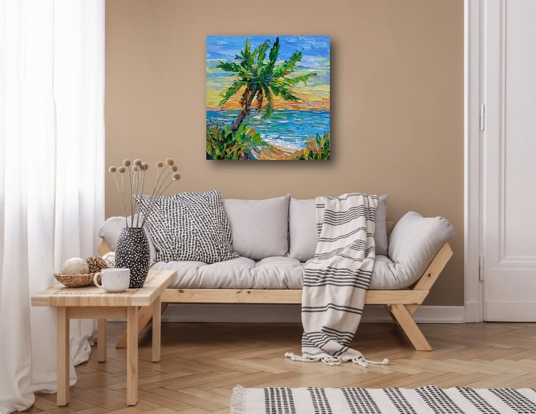 This artwork brings in that vibrant, sun-drenched energy. Bold brushstrokes, palm trees, and a glowing horizon instantly shift the mood of the room.