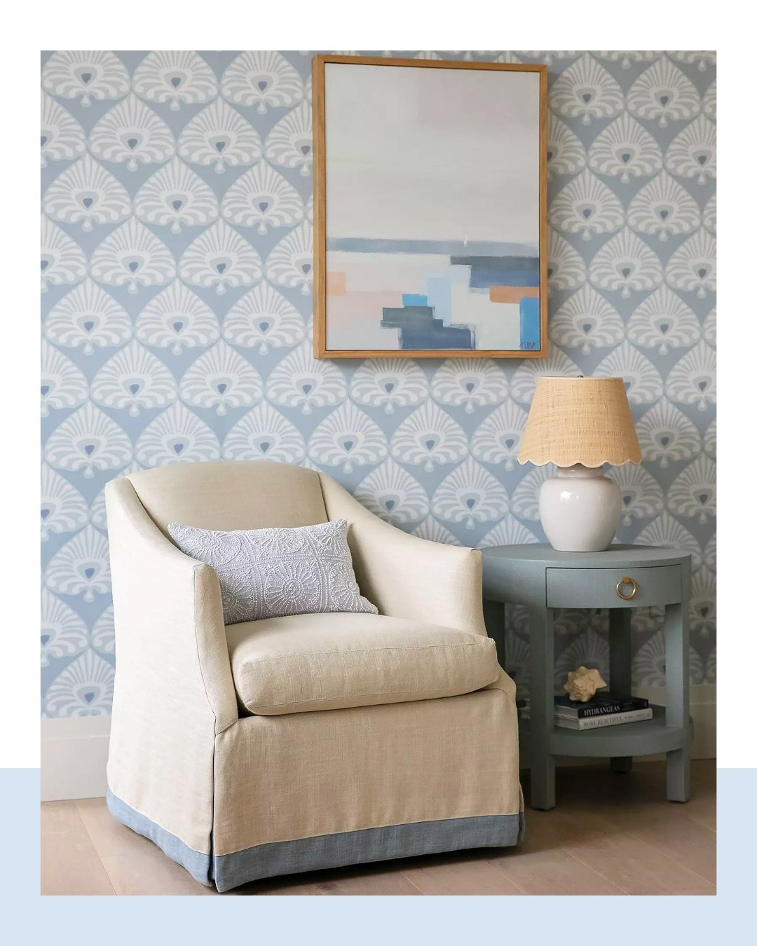 This little corner brings in pattern in such a gentle way. The soft blue wallpaper paired with a tailored chair feels polished but still relaxed.