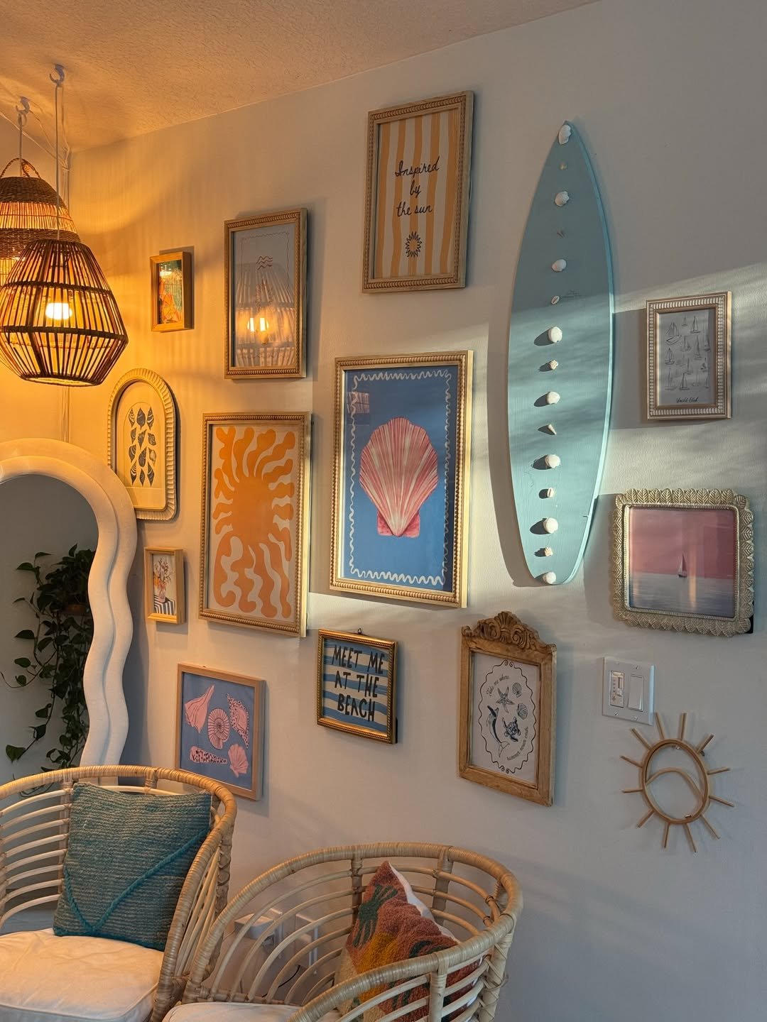 This wall feels like a curated memory board from summers by the sea. Mixed frames, soft pastels, and a surfboard detail bring in a fun, layered energy.
