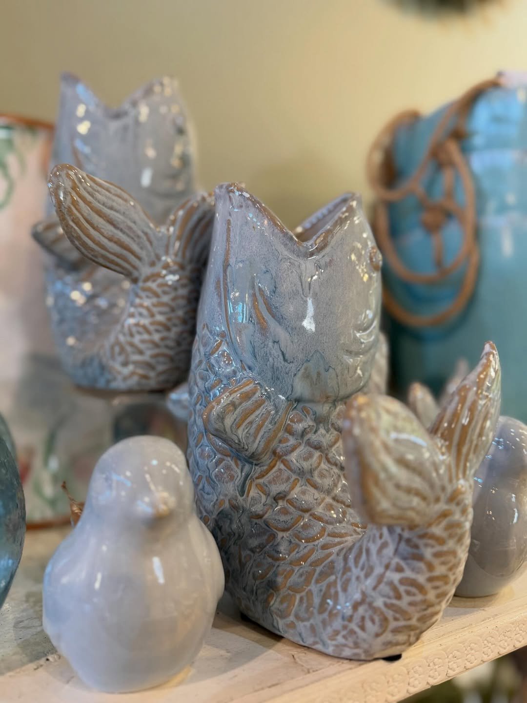 There’s something quietly playful about these glazed ceramic pieces. The soft sheen and organic shapes catch the light in a way that feels almost like they’ve just been pulled from the water.